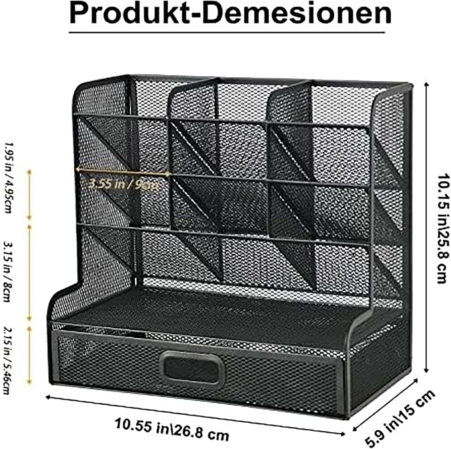 - ✏️ 【Genug Kapazität】: Set mit 9 Fächern mit einem Gestell, genug Fächer, um eine einfache Organisation zu ermöglichen. Grosse Kapazität, multifunktional hilft Ihnen, die Schreibtischutensilien sauber und ordentlich zu organisieren. Die beste und sicherste Aufbewahrungsmöglichkeit für Sie. Perfekte Grösse: 26,9 x 9,9 x 20,8 cm.