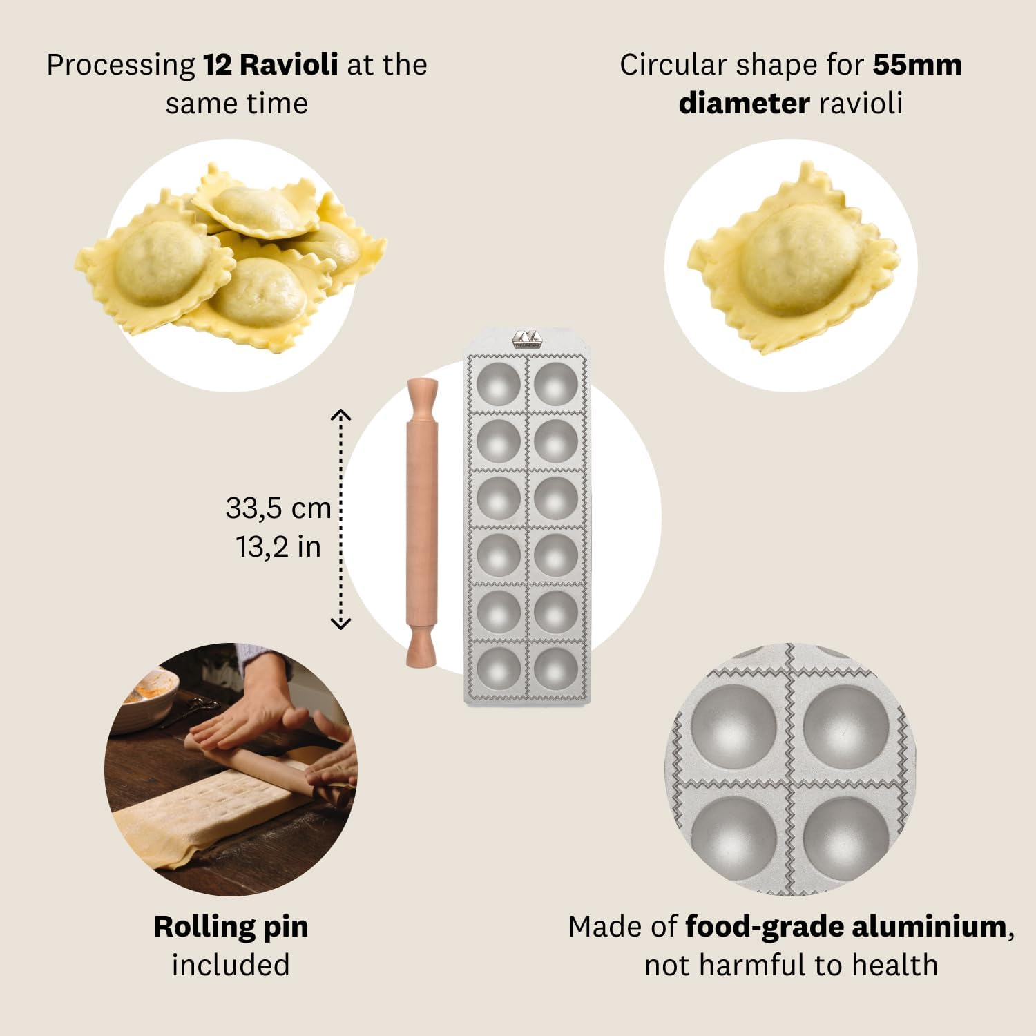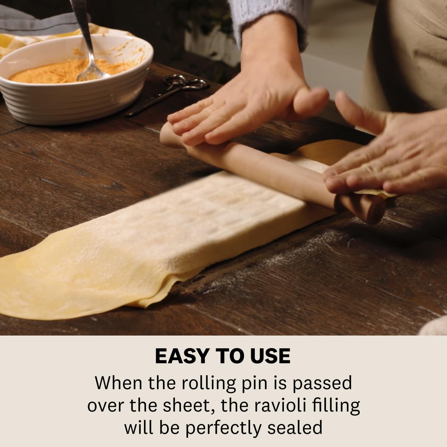 - Wenn das Nudelholz über das frische Eierteigblatt fährt, wird die Ravioli-Füllung perfekt verschlossen. Auf diese Weise quillt die Füllung beim Kochen nicht heraus, Nudelholz enthalten