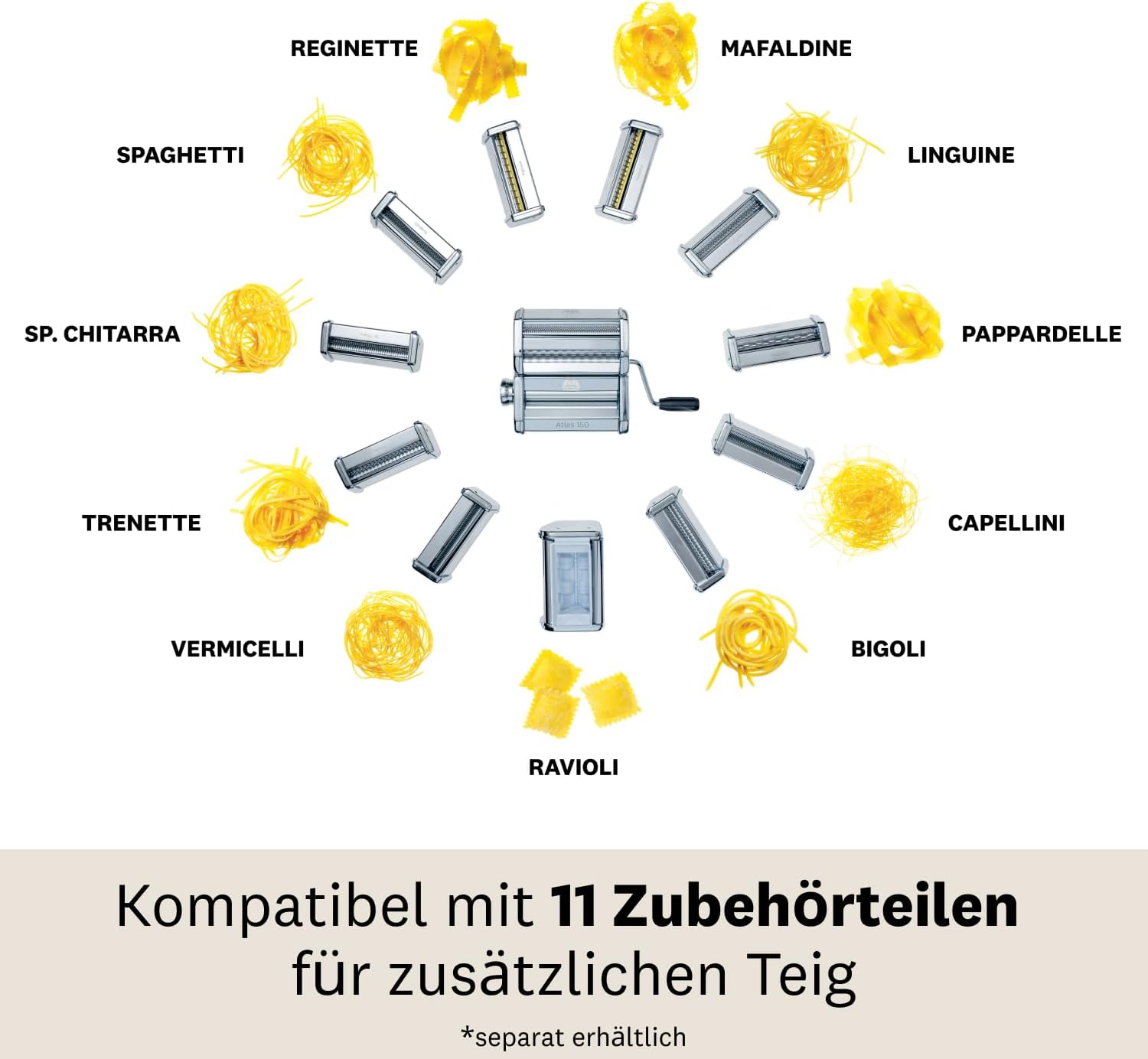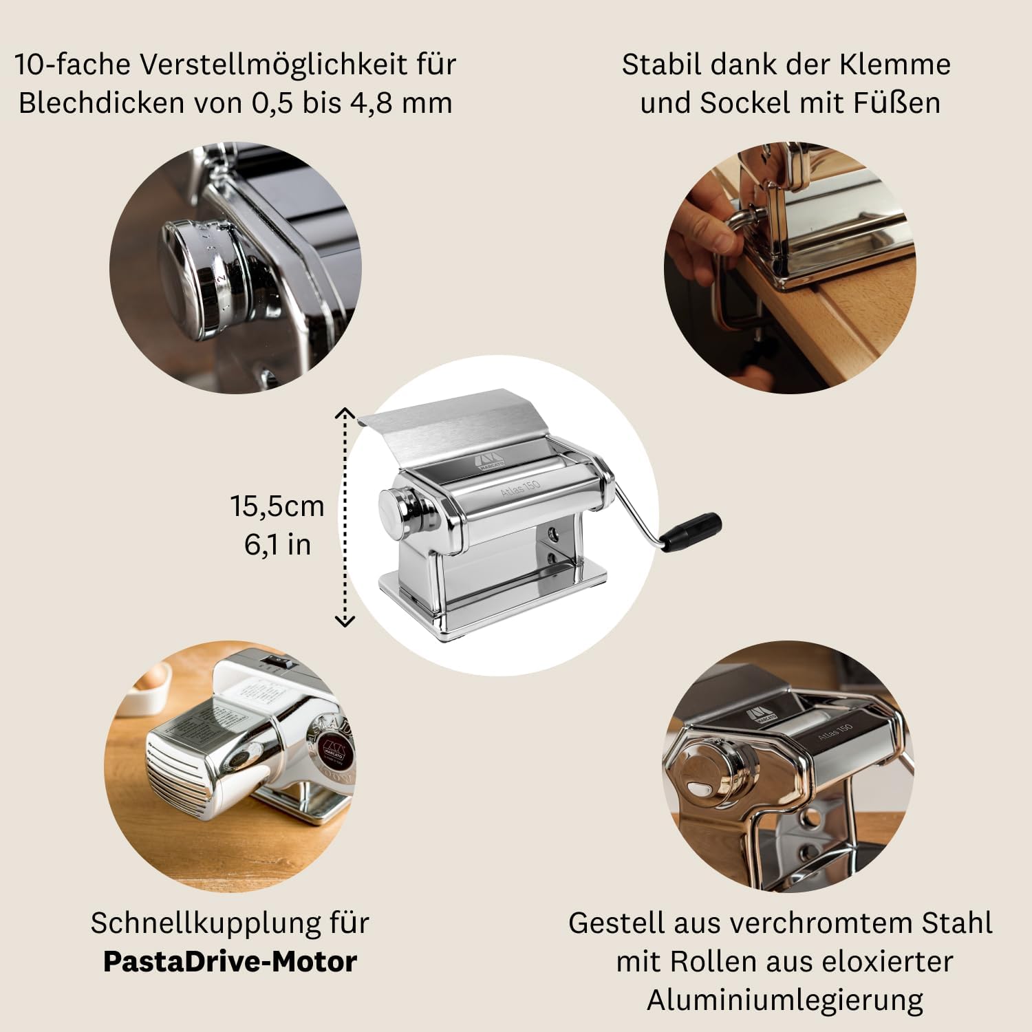 - Dank der leicht zu befestigenden Tischklammer und den unten angeschraubten Gummifüsschen ist Atlas Slide äusserst stabil und solid, was die Zeit für die Zubereitung der Nudeln verkürzt