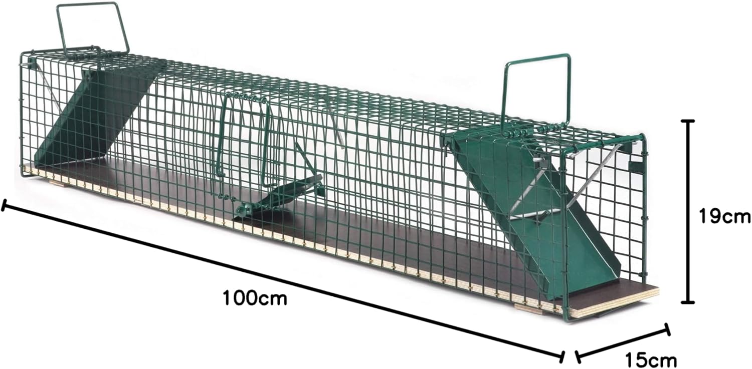 • Die Falle ist dank ihrer Länge von 100cm geeignet für Tiere wie Marder und Iltis, aber auch kleinere Tiere wie Siebenschläfer und Ratten. Der Eingang ist absichtlich schmal damit keine Katzen rein gehen, für Marder ist das mehr als genug.