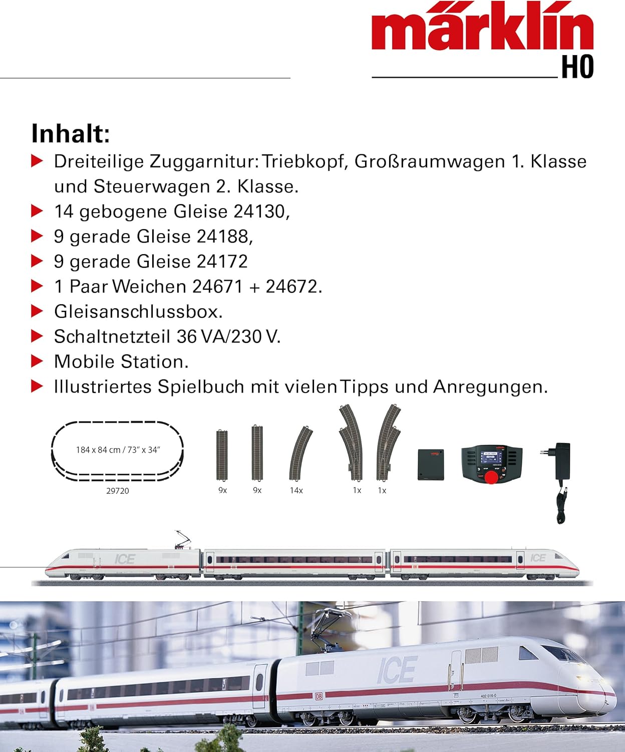 - Inhalt: 14 gebogene Gleise (Art. 24130), 9 gerade Gleise (Art. 24188), 9 gerade Gleise (Art. 24172) und 1 Paar Weichen (Art. 24671) und (Art. 24672) Gleisanschlussbox. Schaltnetzteil 36 VA/230 V. Mobile Station.