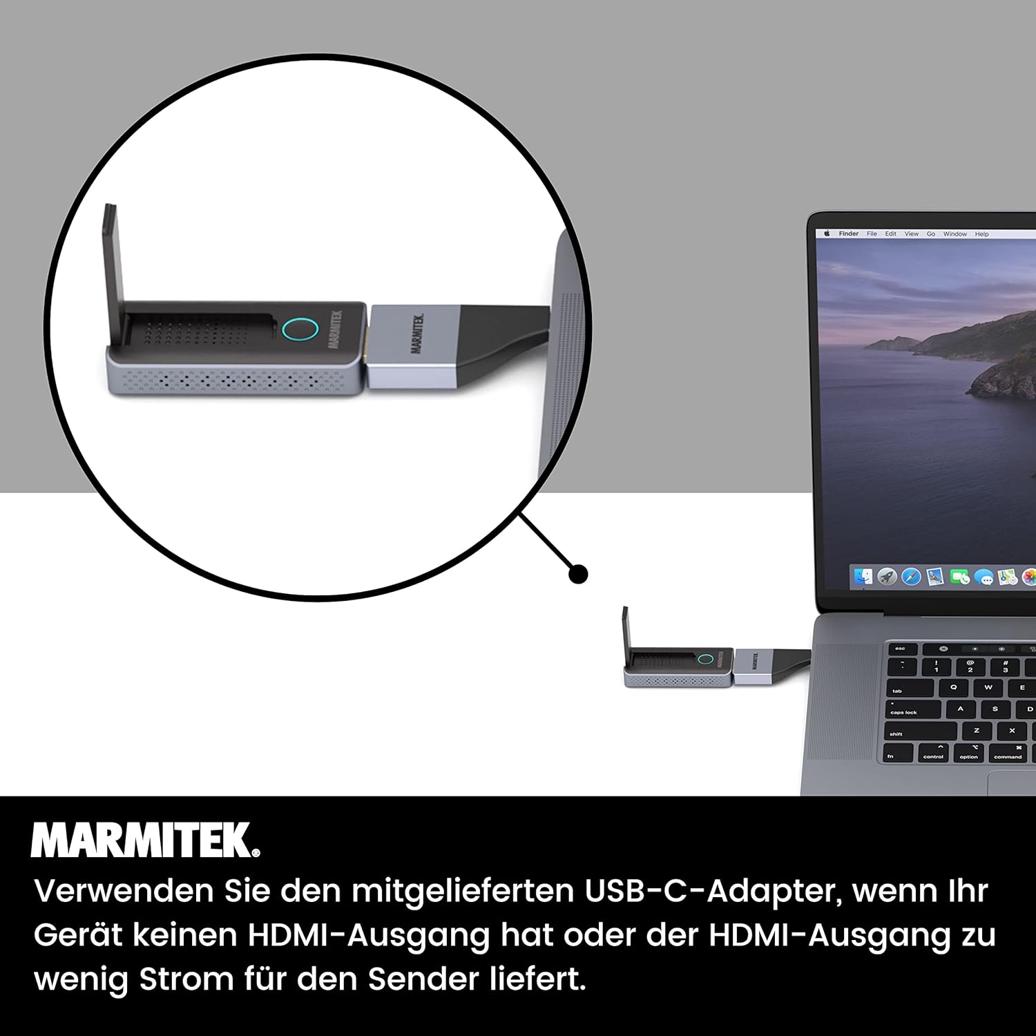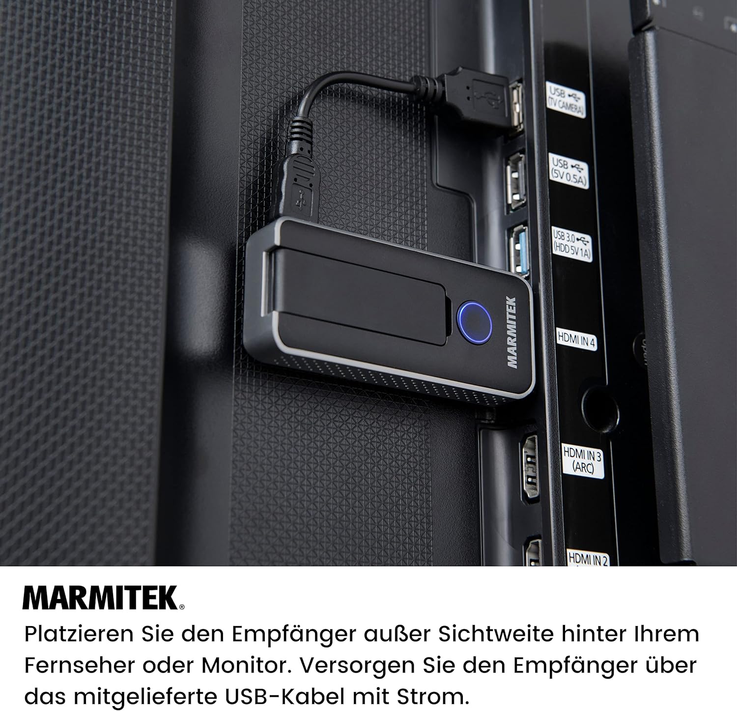 - AN HDMI ANSCHLIESSEN - Schliessen Sie den HDMI-Empfänger an den HDMI-Eingang Ihres Displays oder Projektors an und versorgen Sie ihn über einen USB-Anschluss mit Strom.