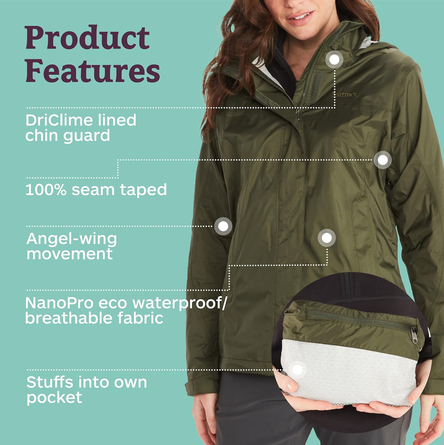 PRODUKTBESCHREIBUNGEN Women's PreCip Eco Jacket - Regenjacke für Damen Zum 20-jährigen Jubiläum der meistverkauften Marmot-Regenjacke hat Marmot der PreCip ein umweltbewusstes und leistungsstarkes Upgrade gegönnt: die leichte PreCip Eco Jacket. Das wasserdichte und atmungsaktive, PFC-freie Marmot NanoPro™ Obermaterial aus recyceltem Nylon hält länger als je zuvor, dank der fortschrittlichen Technologie der mikroporösen Beschichtung. Robuster und langlebiger als je zuvor ist die regendichte Hardshelljacke mit einem patentierten Dry-Touch-Finish ausgestattet, das sie zu deinem Lieblings-Allrounder an regnerischen Tagen machen wird. Abgerundet wird der Windbreaker durch eine aktualisierte Passform, eine verstaubare Kapuze, einen verstellbaren Saum und wärmeableitende Unterarmbelüftungen. Der mit DriClime™ gefütterte Kinnschutz leitet Feuchtigkeit ab und verhindert so Wundscheuern. Solltest du den Regenmantel mal nicht brauchen, lässt er sich platzsparend in seiner eigenen Tasche verstauen. Hauptinformationen • Typ: Regenjacke mit Kapuze • Passform: Normal geschnitten • Saison: ganzjährig • Bekleidungsschicht: Wetterschutz / Outlayer Mass • Gewicht: 247 g • Rückenlänge: 70 cm Wetterschutz • Wassersäule: 10.000 mm • Atmungsaktivität: MVTR-Wert: 17.000 g/m²/24h Eigenschaften • Wasserfest, winddicht, atmungsaktiv, klein verpackbar, ultraleicht, 100% getapte Nähte, viel Bewegungsfreiheit Ausstattung • 2-fach verstellbare Kapuze mit Kordelzug & Klett, in den Kragen einrollbar • 2 Reissverschlusstaschen aussen • Per Kordelzug verstellbarer Saum • Verstellbare Ärmelbündchen mit Klettverschluss • Unterarm-Reissverschlüsse zur Belüftung • Vorgeformte Ellenbogenpartien • Fleece-gefütterter Kinnschutz • In der eigenen Seitentasche verstaubar Material • Aussenmaterial: NanoPro™ Eco 100% Recycled Nylon Ripstop 2.4 oz/yd; 2,5 Lagen Einsatzbereich / Aktivitäten • Urban, Wandern, Fahrradfahren Nachhaltigkeit • Aus 100% recyceltem Material • bluesign-zugelassenes Material • PFC-freie DWR-Imprägnierung