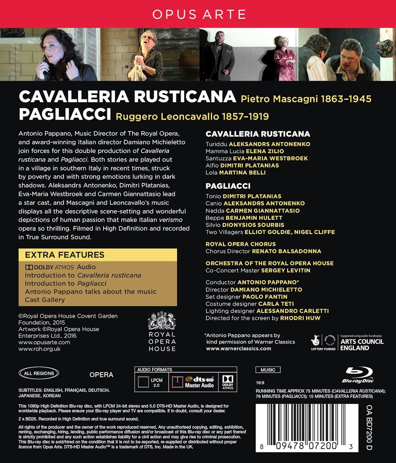 PRODUKTBESCHREIBUNGEN KURZBESCHREIBUNG " These two short Italian operas are brought together in a new staging by award-winning director Damiano Michieletto, who sets both operas in a poverty stricken village in 1980s southern Italy, where the Mafia has a hold. The Royal Opera's Music Director Antonio Pappano conducts a cast that includes charismatic Dutch soprano Eva-Maria Westbroek, exciting Italian soprano Carmen Giannattasio and the thrilling Latvian tenor Aleksandrs Antonenko. Press Reviews "A triumphant evening, supported by superb work by adult and junior choruses, and by orchestral playing under Antonio Pappano which faithfully reflects the brilliant colouring of these verismo classics. And if Mascagni's opera emerges in its full pathos and purity, Leoncavallo's becomes the occasion for a directorial tour de force. Here Antonenko is the cuckolded Canio, and Platanias the bitterly insidious Tonio, with both giving charismatic performances; Benjamin Hulett makes a predictably sweet-toned Beppe, while Carmen Giannattasio's ravishing singing as Nedda literally charms the birds off the trees." (The Independent ★★★★) "Damiano Michieletto has surely won new fans with this intelligent updating... The Royal Opera orchestra was on magnetic form for both operas, with Pappano holding all in tight rein yet letting the music breathe... the Greek baritone Dimitri Platanias came into his own as the hideous, rapacious Tonio, with Antonenko expansive and pathetic as the maniacally jealous clown Canio. His famous aria Vesti la giubba when he puts on his motley to act out his own destiny had the right balance of chill and misery, helped by Michieletto's clever staging. The audience roared approval, for Damiano Michieletto and his team too." (The Guardian) "Carmen Giannattasio's Nedda made us feel the longing for freedom behind her illicit desire for Silvio (the ardent Dionysios Sourbis). Antonio Pappano has spoken of the way this music runs through his southern Italian veins and it certainly throbbed with authentic passion. If he responded faithfully enough to the shameless vulgarity of the two scores, he was also sensitive to their generosity of lyricism and subtleties of orchestration. " (The Evening Standard ★★★★) "Antonio Pappano conducts: being of Campanian ancestry, this music is mother's milk to him, and he coaxed the orchestra into a lush, uninhibited reading of the scores, feeding the climaxes with plenty of whatever the Italian is for welly. Terrific triple fortissimi blasted from Renato Balsadonna's chorus too; and Cav's rapturous Easter Hymn was uplifting." (The Telegraph ★★★★) Cast Aleksandrs Antonenko (Turiddu/Canio) Dimitri Platanias (Alfio/Tonio) Eva-Maria Westbroek (Santuzza) Carmen Giannattasio (Nedda) Elena Zilio (Mamma Lucia) Martina Belli (Lola) Orchestra & Chorus of the Royal Opera House; Antonio Pappano Production Company: The Royal Opera Stage Director: Damiano Michieletto Designer: Paolo Fantin Disc Information Catalogue Number: OABD7200D Date of Performance: 2015 Running Time: 153 minutes Sound: LPCM 2.0, DTS Surround, Dolby Atmos Aspect Ratio: 16:9 Subtitles: EN/FR/DE/JP/KO Label: Opus Arte" REZENSION Italian composer Pietro Mascagni was born in Livorno, Tuscany, in 1863. He enjoyed immense success both as a composer and conductor of his own and other people's music and created a variety of styles in his operas: the exotic flavor of Iris, the idylls of L'amico Fritz and Lodoletta, the steely power of Il piccolo Marat, and the post-romanticism of the lush Parisina. Despite this versatility, he is easily best known for the Sicilian passion and warmth of his 1890 masterpiece Cavalleria Rusticana, which caused one of the greatest sensations in opera history and single-handedly ushered in the Verismo movement in Italian dramatic music. Like Mascagni, Ruggero Leoncavallo has also sometimes been called a one-opera man,although he produced numerous operas and other songs throughout his career(Mattinata was popularised by Enrico Caruso),as well as the symphonic poem La nuit de mai. His most lasting contribution to the operatic repertoire is undoubtedly his short two-act work Pagliacci, written in 1892 and still one of the most-performed operas worldwide. Cavalleria Rusticana and Pagliacci are often produced together as a double bill and here award-winning Damiano Michieletto directs new productions of these crowd-pleasing operas, both set in a poverty stricken village in 1980s southern Italy, where the Mafia has a hold. Antonio Pappano conducts the Royal Opera House Orchestra and Chorus and the cast members include charismatic Dutch soprano Eva-Maria Westbroek (Santuzza), Italian soprano Carmen Giannattasio (Nedda), Elena Zilio (Mamma Lucia), Dimitri Platanias (Tonio), and the wonderful Latvian tenor Aleksandrs Antonenko (Turiddu). --New Classics, Oct'16 Antonio Pappano knows exactly how these pieces should go, while the ROH forces play and sing their hearts out in realising them, Performance **** Recording *** --BBC Music Magazine,Christmas'16 Mehr
