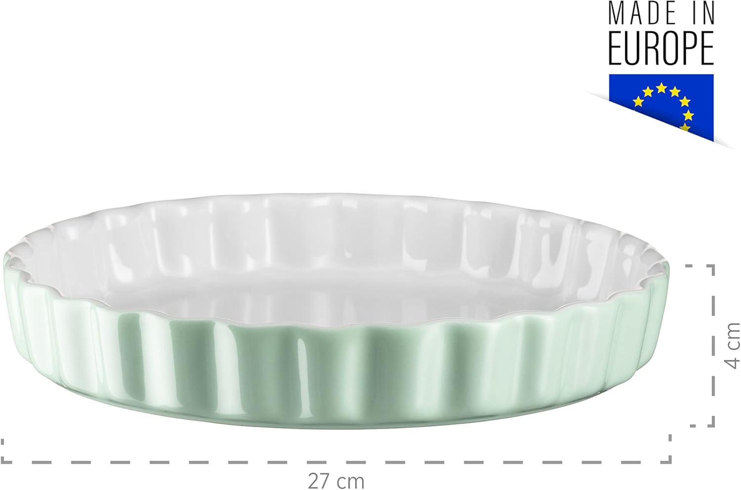 - Schöne Backform mit gewelltem Rand aus dickwandiger Keramik (Steinzeug) für Tarte, Quiche und Obstkuchen. Lasur innen weiss, aussen in pastelligem Hellgrün
