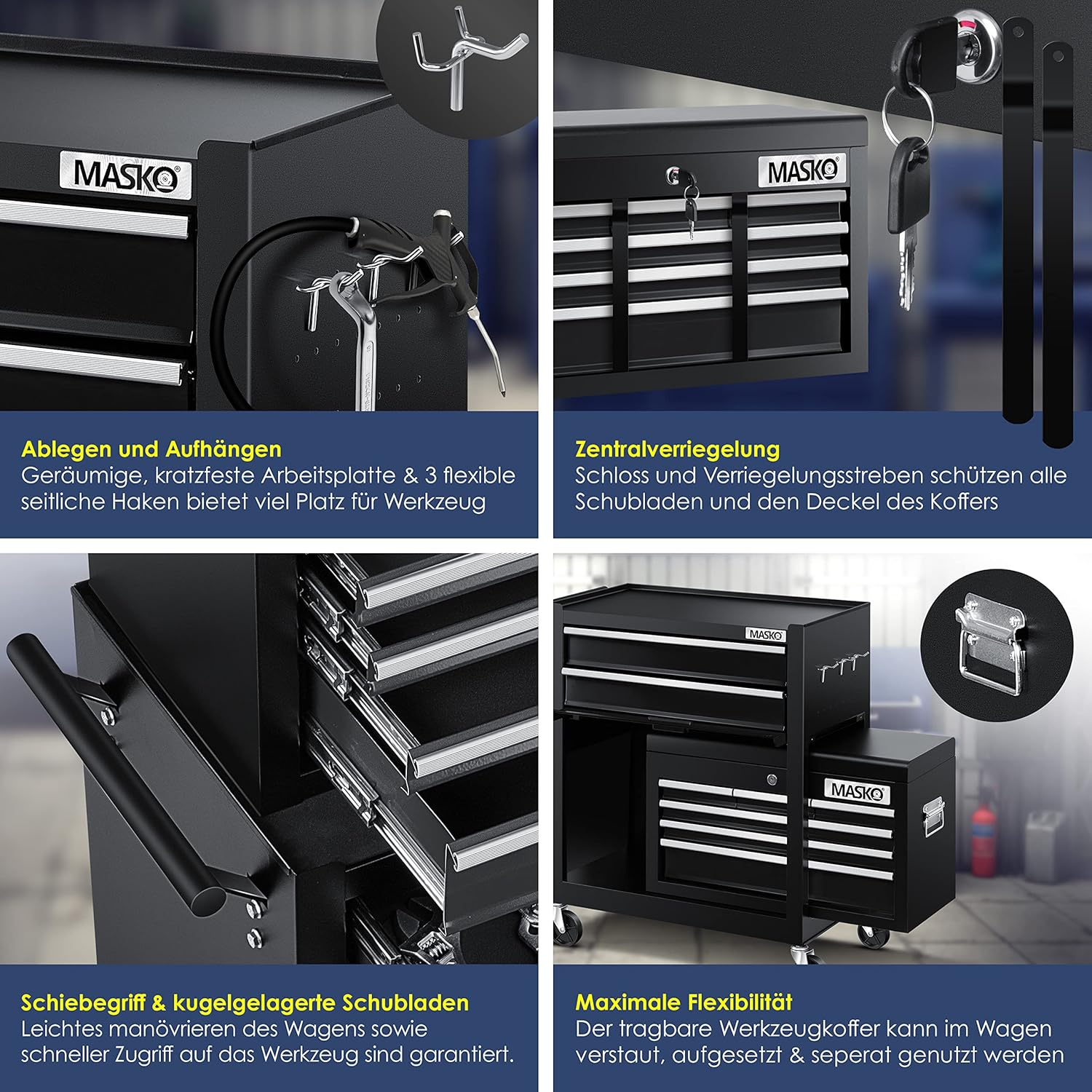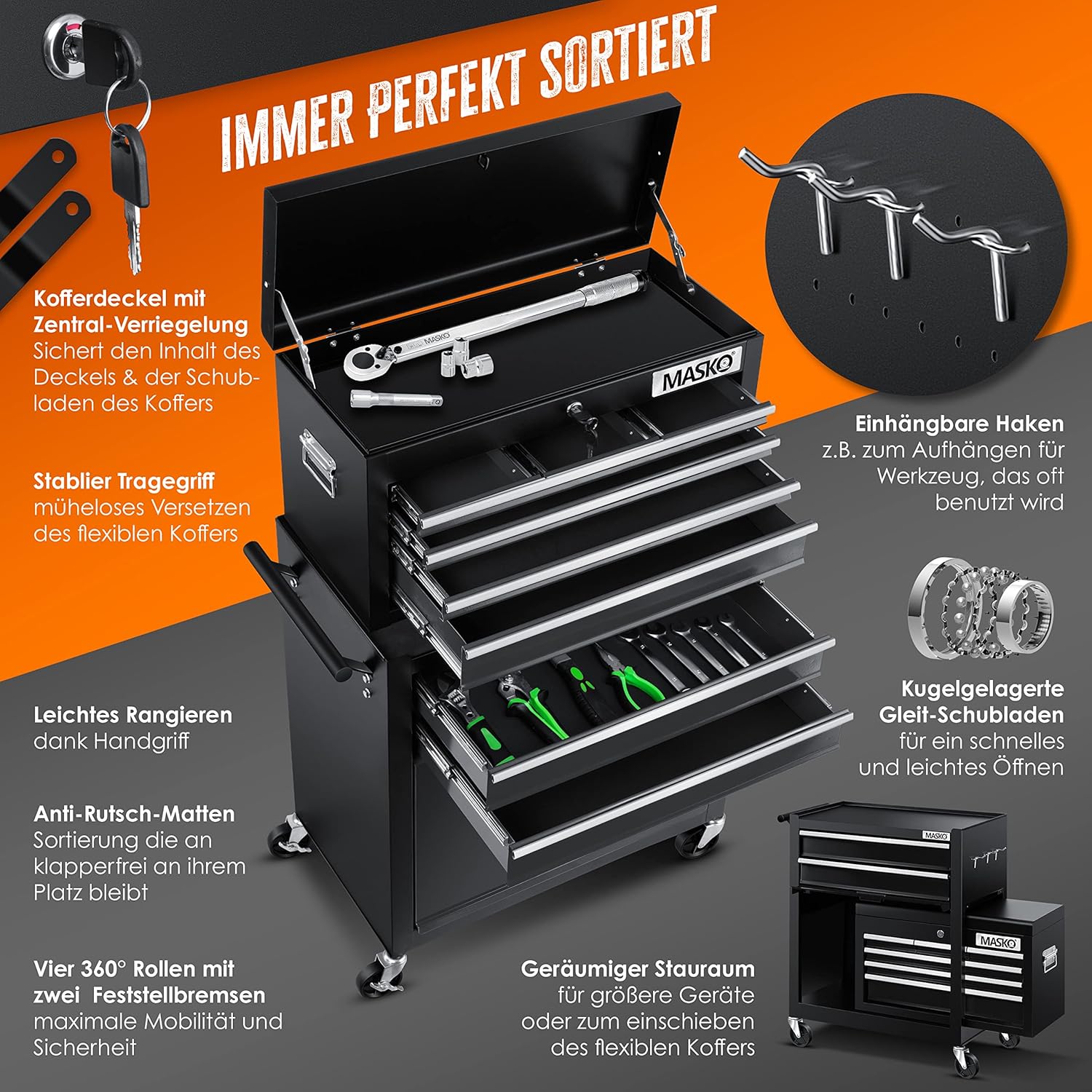 - ๐๐๐๐๐๐ ๐๐๐๐๐๐๐๐๐๐๐๐๐๐: Mit dem MASKO Werkzeugwagen inkl. Koffer entscheiden Sie sich nicht nur fรผr einen optimalen Ordnungshalter, sondern auch fรผr eine ideale und effiziente Sortierung Ihres
