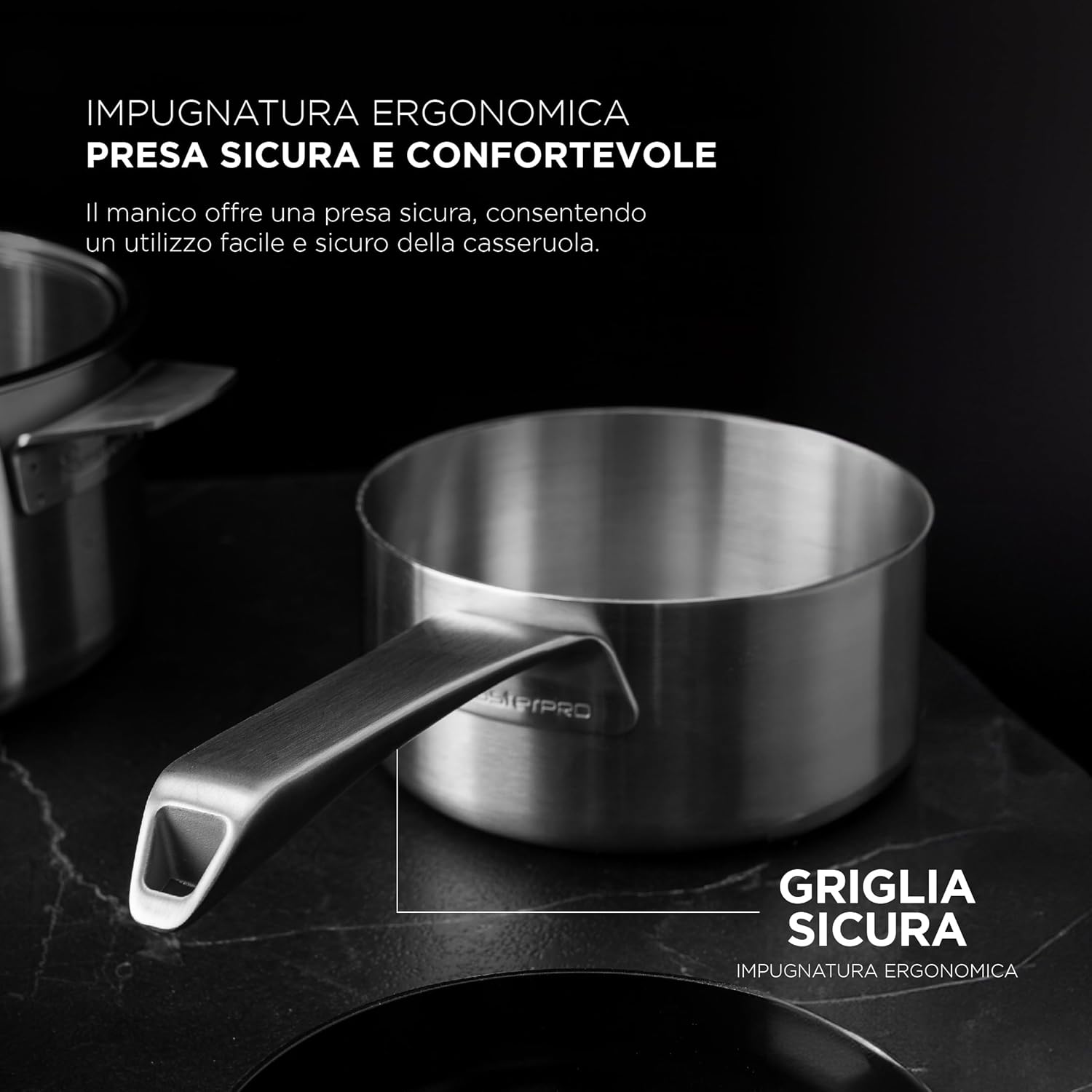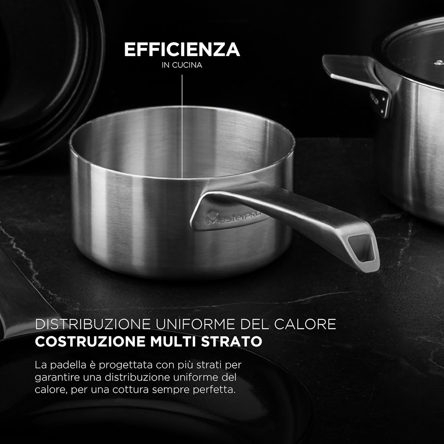 - MEHRSCHICHTIGE KONSTRUKTION: Die Pfanne ist mehrschichtig aufgebaut, um eine gleichmässige Wärmeverteilung zu gewährleisten und die Kocheffizienz zu verbessern.