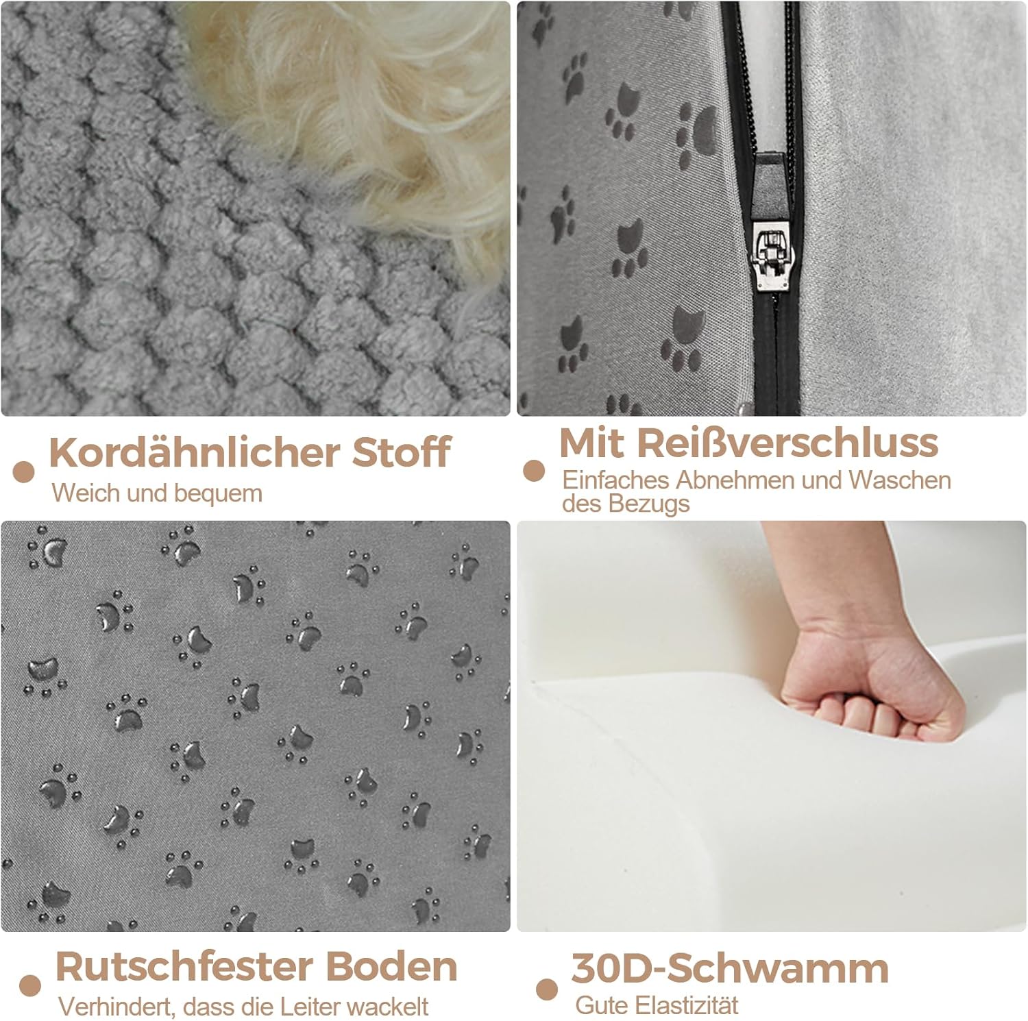 • 🐾 Premium-Sicherheitssystem: Abnehmbarer Cord-Bezug mit Wildleder-Applikationen & Silikon-Pfotenabdruck an der Unterseite. Maschinenwaschbar, schmutzabweisend – optimale Hygiene für Hundetreppen-Bett-Kombinationen.