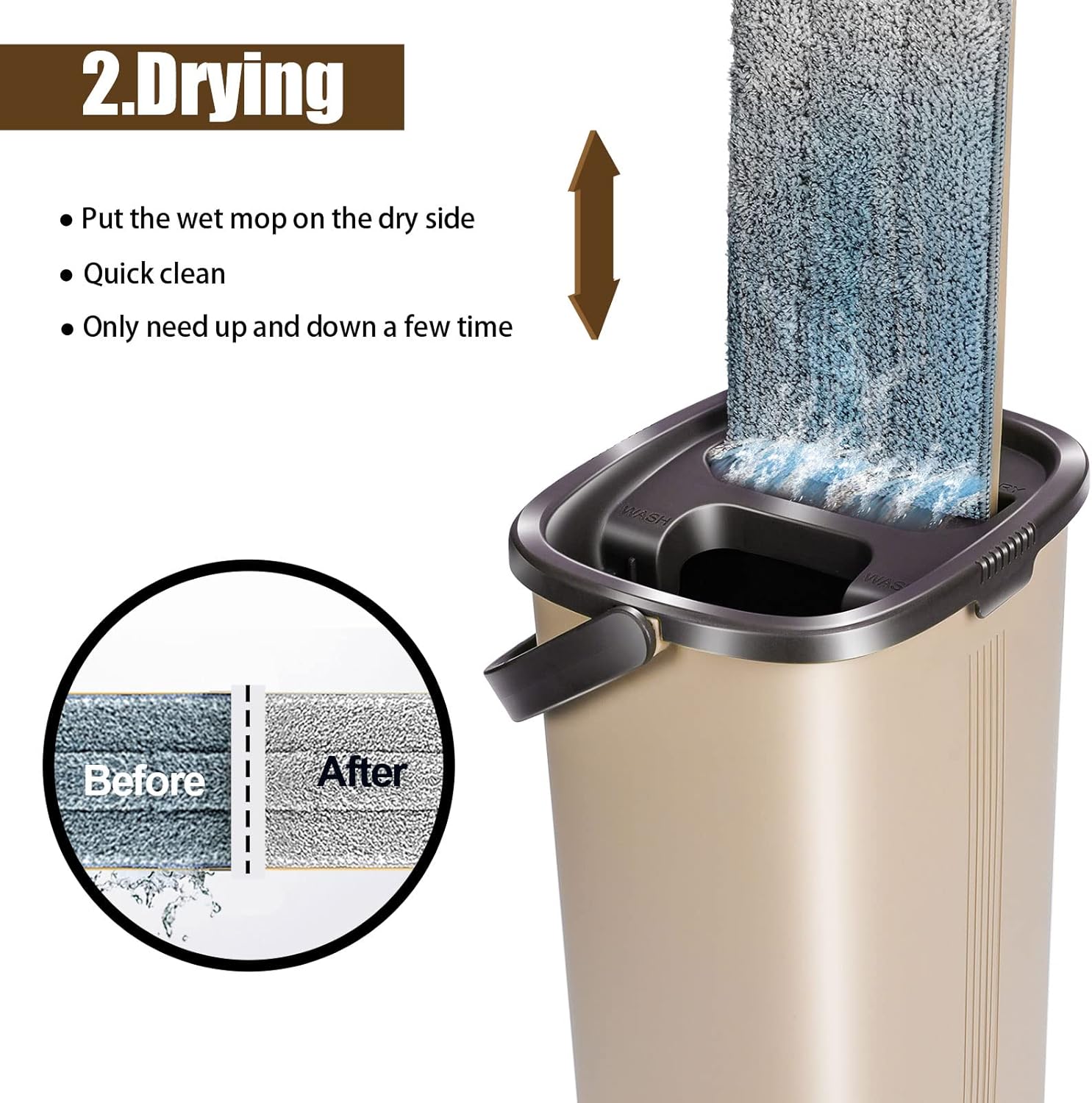 - ◆[2 in1 Wischeimer]: Unser Wischmop- und Eimer-Set ist mit einem Drehsystem ausgestattet, der Eimer ist in eine Trocken- und eine Waschseite unterteilt. Sie können den Mopp ganz einfach auf der Waschseite waschen, Sie müssen den Mopp nicht von Hand waschen. Die Trockenseite des Eimers hat Borsten, um Haare und Flecken leicht vom Mopp zu entfernen. Sie müssen nur ein paar Mal auf und ab ziehen, um den Mopp schnell zu trocknen, verbessern effektiv Ihre Reinigungseffizienz.