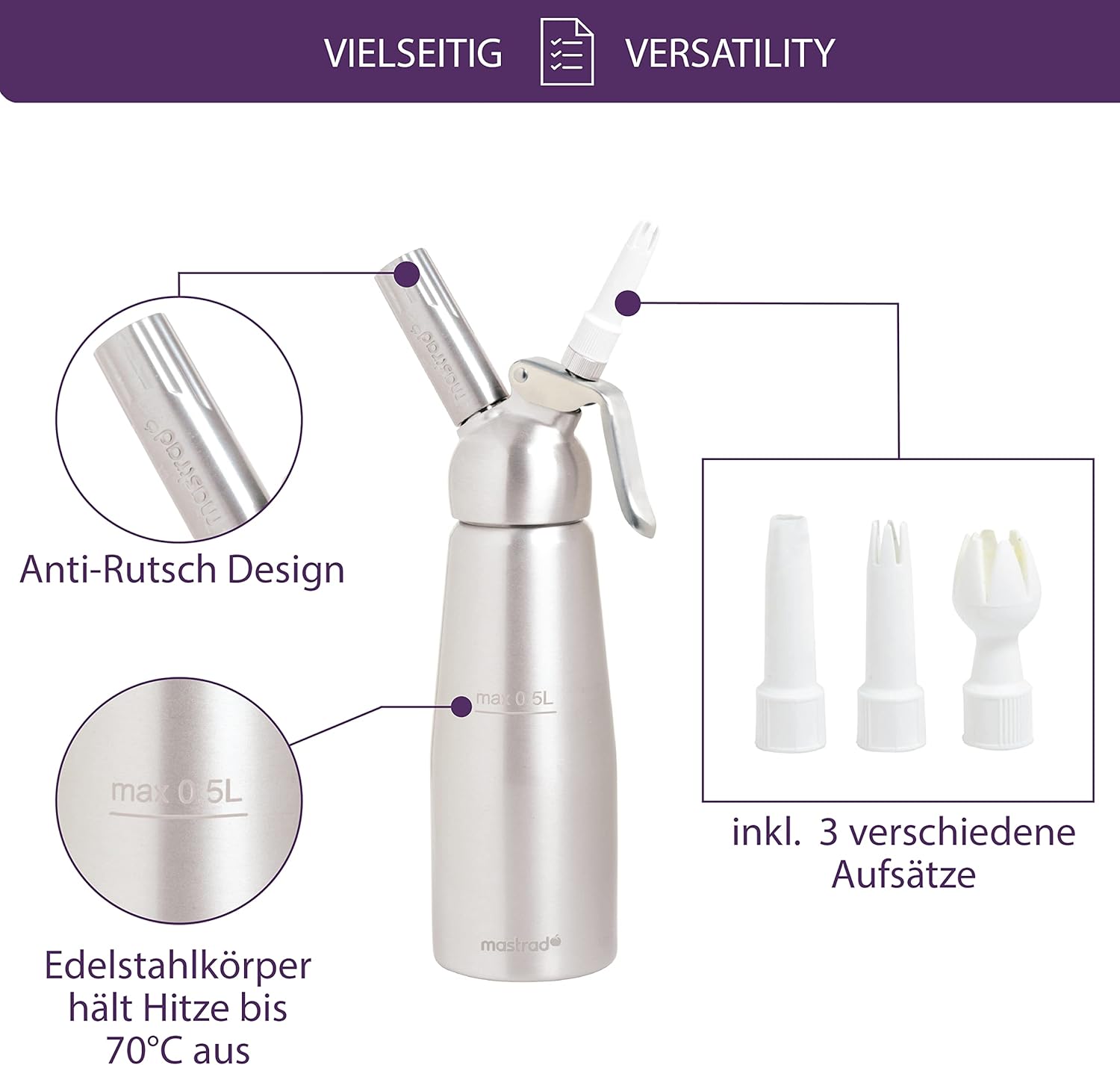- BREITE MULTIFUNKTIONALITÄT: Der Sahnespender eignet sich ausgezeichnet für warme wie kalte Zubereitungen, beispielsweise für Ihre Saucen, Cremes, Schlagsahne, Mousses aber auch für Fisch oder püriertes Gemüse.