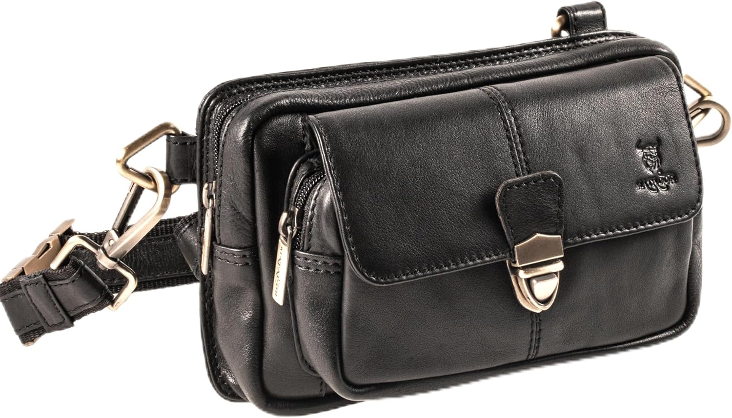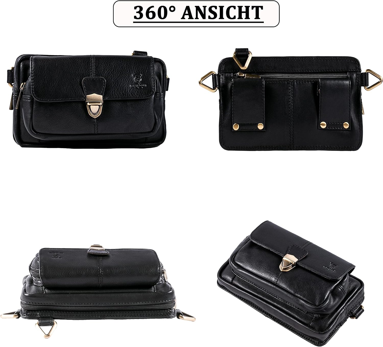 - 《 KLARE ORDNUNG 》─ 1 grosses Hauptfach mit Reissverschlussfach, 1 Aussenfach/Handyfach an der Front mit Reissverschluss und Schnappverschluss, sowie 1 Reissverschlussfach auf der Rückseite machen diese Ledertasche zu einem echten Allrounder.