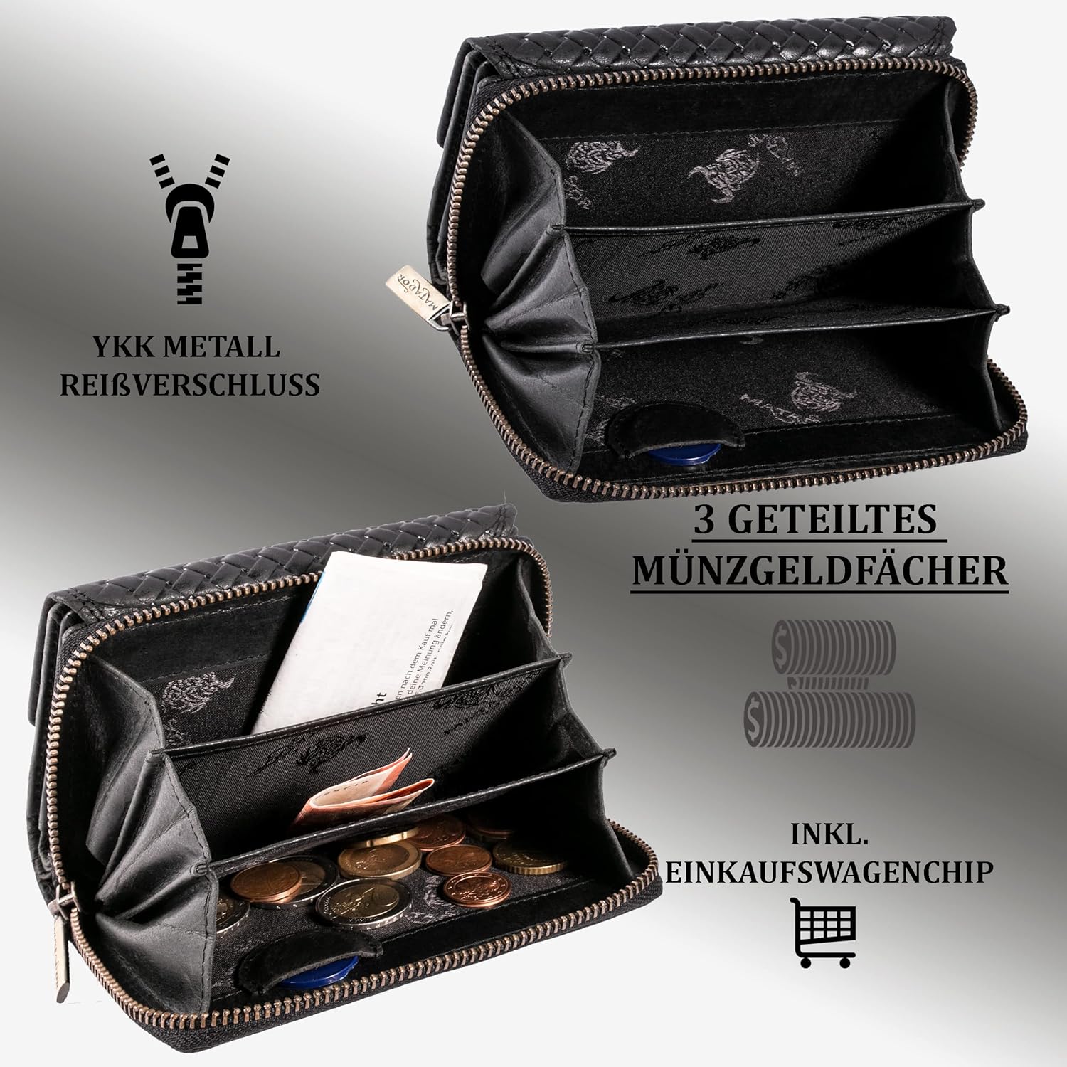 - 10 Kartenfächer jedes einzeln genäht ist - 2 Fächer mit Sichtfenster - 2 Geldscheinfächer - 3 geteilte Kleingeldfächer mit Reissverschluss - 1 verstellbarer Überschlag mit Druckknopfverschluss