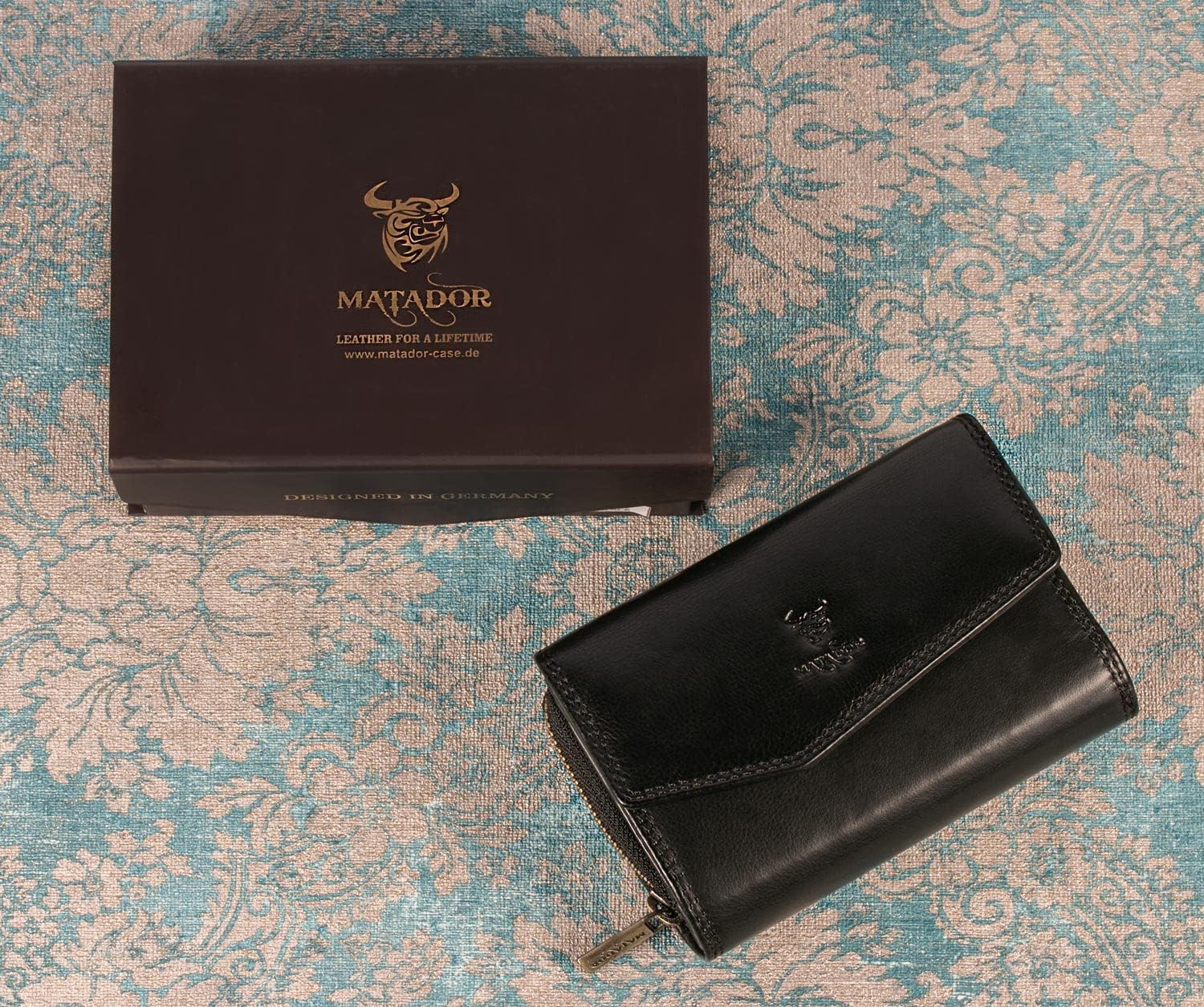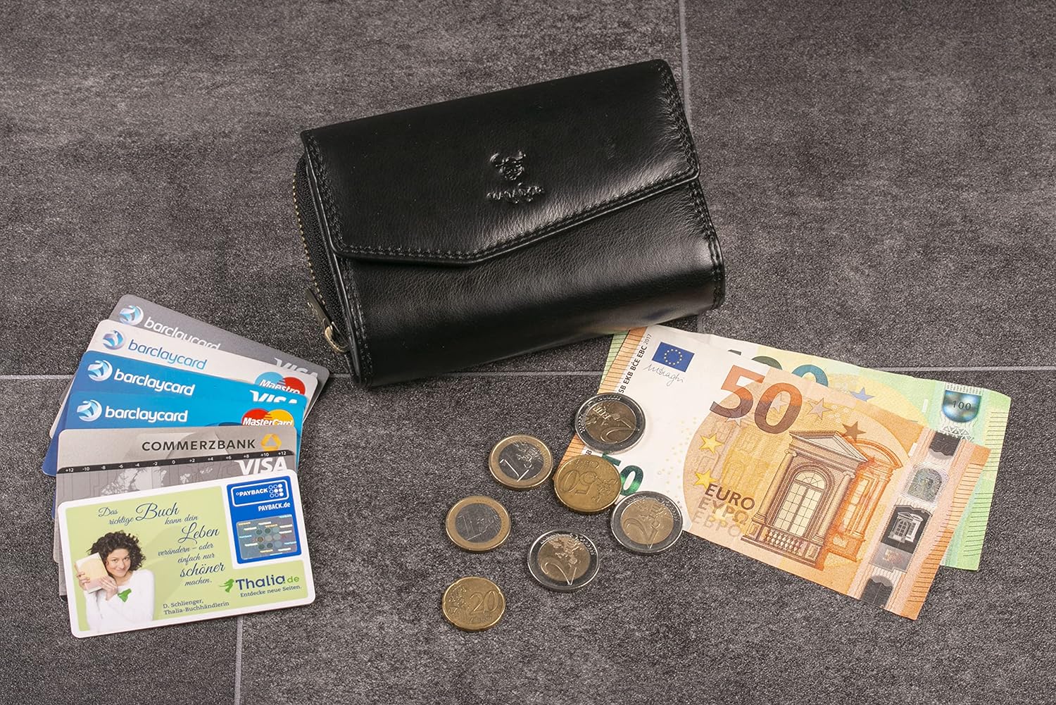 - 10 Kartenfächer jedes einzeln genäht ist - 2 Fächer mit Sichtfenster - 2 Geldscheinfächer - 3 geteilte Kleingeldfächer mit Reissverschluss - 1 verstellbarer Überschlag mit Druckknopfverschluss