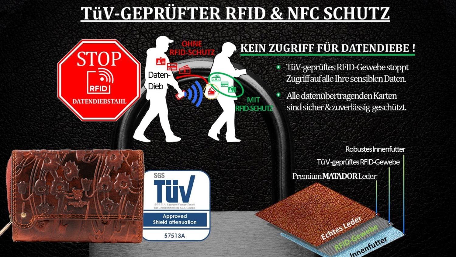 - ✅ HANDGEFERTIGTES UNIKAT - Die Matador Ladies Wallet wird in liebevoller Handarbeit aus hochwertigem ECHTLEDER angefertigt. Eine präzise Doppelnaht der Ränder macht dieses kleine Portemonnaie dabei robust & strapazierfähig.