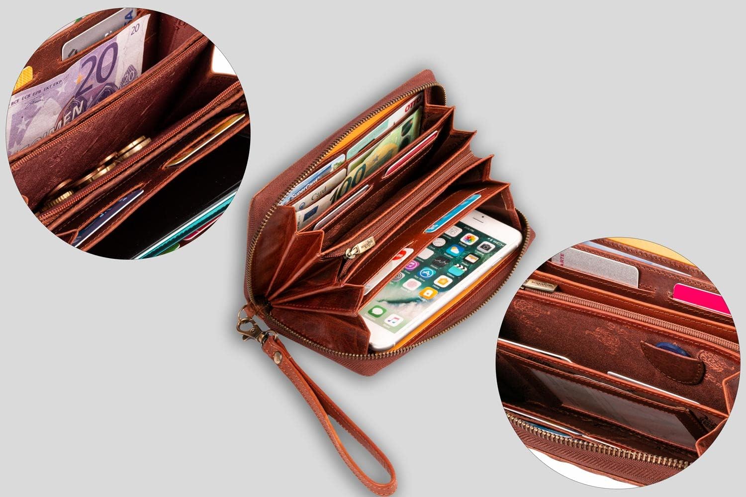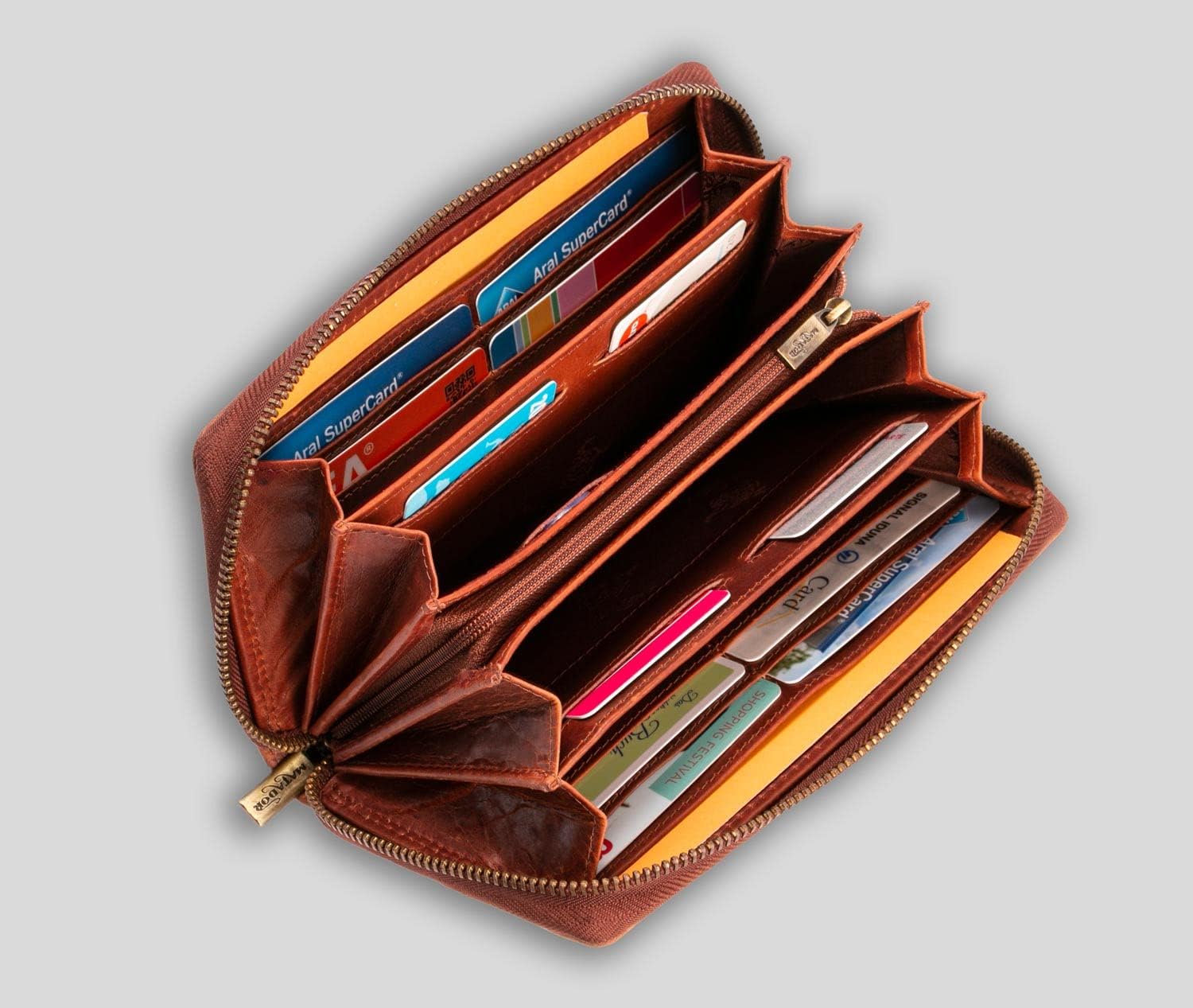 • 12 Kartenfächer jedes einzeln genäht - 1 Fach mit Sichtfenster - 1 geteiltes Kleingeldfach - YKK Reissverschluss