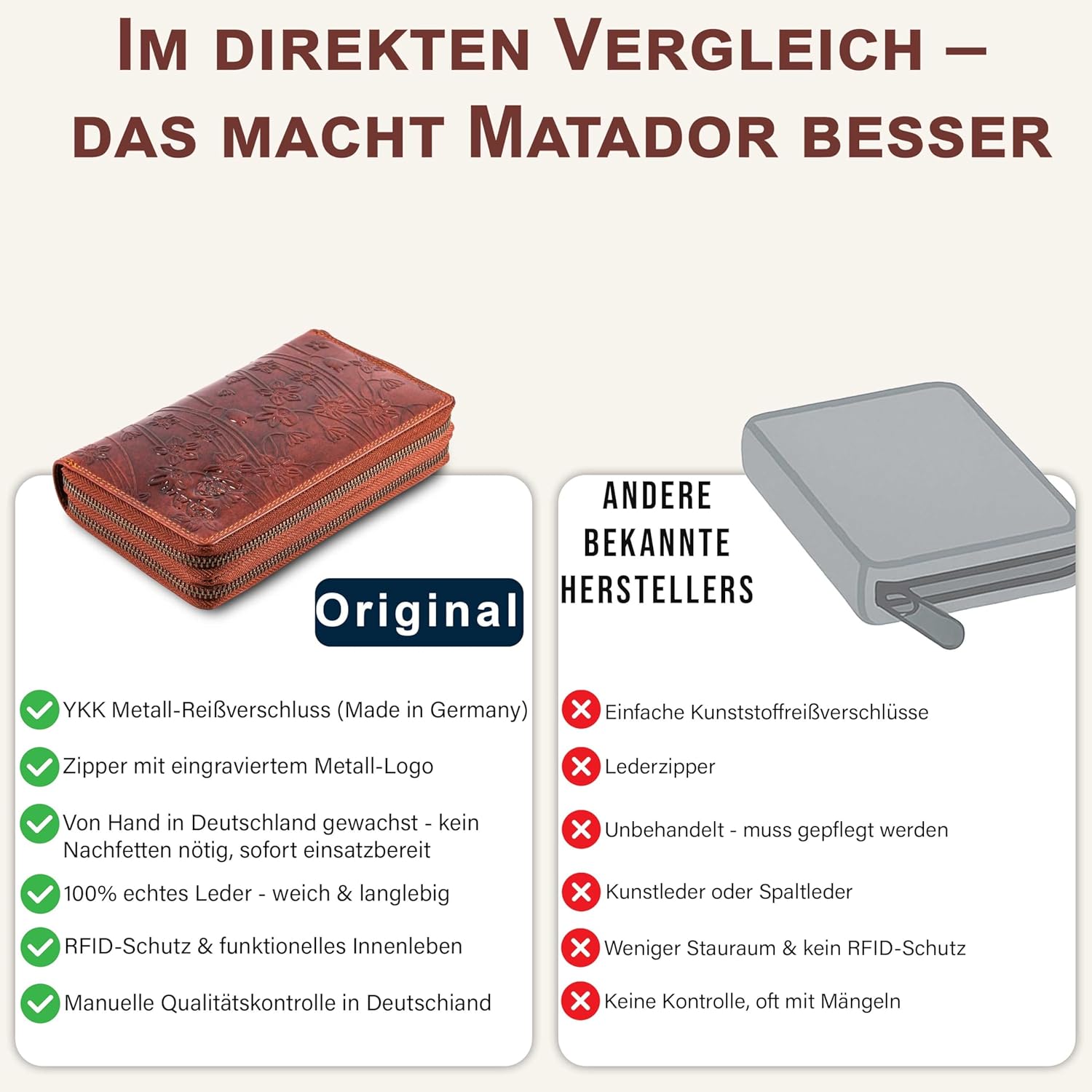 - ✅ DAMEN PORTEMONNAIE LEDER – Die MATADOR Portemonnaie Damen ist aus exklusivem, hochwertigem Leder gefertigt und von erfahrenen Handwerkern mit einem strapazierfähigen Stoff bezogen.