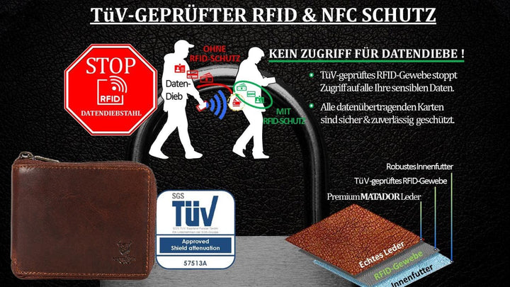 - TÜV GEPRÜFTER RFID & NFC BLOCKER - Das Innenfutter bietet wirksamen Schutz vor RFID Hackern - Ihre Kreditkarten und EC-Karten sind sicher vor dem Auslesen