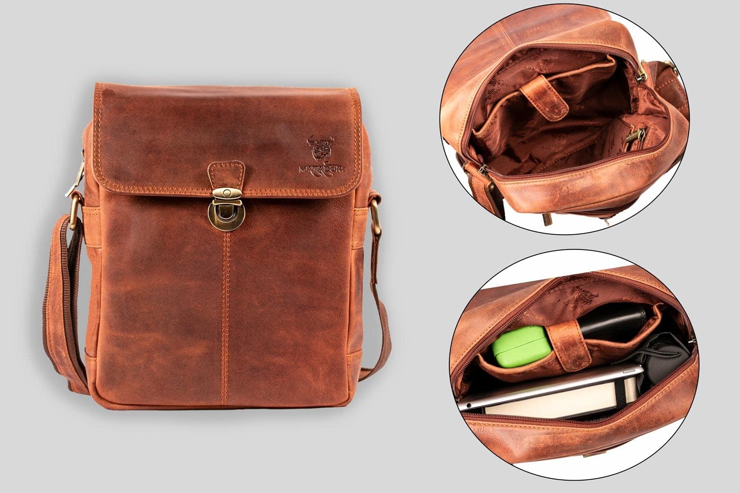 PRODUKTBESCHREIBUNGEN Die hochwertig handgefertigte ECHT LEDER Schultertasche von Matador ist aus pflegeleichtem Antik Leder hergestellt. Sie ist eine lässige Umhängetasche nicht nur für die Urlaub, sondern auch für den Alltag. Das auffällig strukturierte Rindsleder verleiht jeder Tasche ein einzigartiges Aussehen. Der coole Begleiter überzeugt auch im Design und Ausführung, und besticht durch seine einzigartige Kreation. Das geräumige Hauptfach verfügt neben einem unkomplizierten Magnetverschluss auch über einen Reissverschluss. Wichtige Gegenstände wie Bücher, Blocks und Geldbeutel sind sicher verstaut, auch Kleinigkeiten finden in dem praktischen Staufach ihren Platz. Dinge die schnell Griffbereit sein sollen können in dem Fach auf der Rückseite verstaut werden. Ein echter Hingucker, der sich mit dem verstellbaren Umhängeriemen individuell in die Körpergrösse anpassen lässt. Die handgefertigten Matador Taschen verleihen jedem Outfit ein Elegantes aussehen. Bei dieser tollen Messenger-Bag von Matador wurde einfach an alles gedacht! Unsere Naturprodukte werden mit sorgfältiger Handarbeit aus echtem Leder in Europa hergestellt. Zur Herstellung unsere Lederprodukte verwenden wir ausschliesslich Chrome Free Rohleder . Die Farbe der Tasche kann auf Grund der natürlichen Gerbung und Ölung leicht vom aktuellen Foto abweichen. Beachten Sie bitte das Leder ein Naturprodukt ist, welches durch seine Gerbung, Färbung und natürliches Wachstum gezeichnet ist. Hautfehler sowie Farbabweichungen sprechen für die Echtheit des Leders. Abmessung der Tasche : 30 x 23 x 7,5 CM