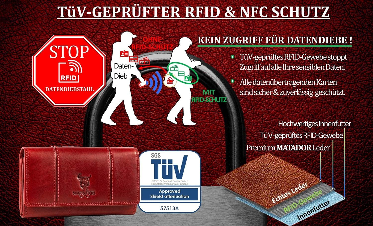 - ✅ SICHERHEIT: Ihre Kredit- und EC-Karten sind in dem MATADOR Damenportmonnaie sicher! Durch den Integrierten TÜV geprüften Portemonnaie RFID Schutz ist ein Auslesen der Karten unmöglich.