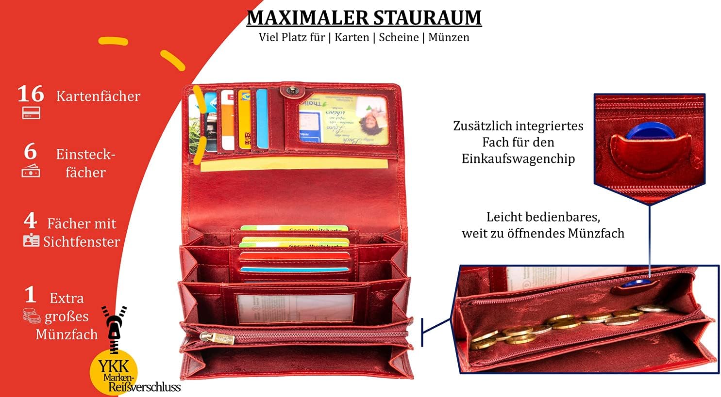 - ✅ GENUG PLATZ: Das Damen Leder Geldbeutel bietet genügend Platz! Es gibt 16 einzeln genähte Kartenfächer, 4 Sichtfenster, 3 Geldscheinfächer und Extra grosses Münzfach.