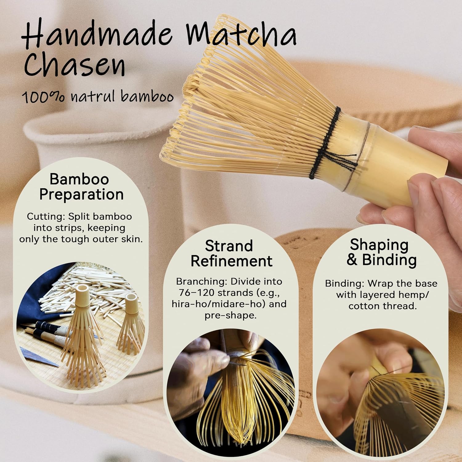 - Handgefertigter Matcha-Besen (Chasen 百本立) – Unser traditioneller Matcha-Besen aus ausgewähltem Bambus bewahrt die natürliche Maserung und bietet dabei Widerstandsfähigkeit und Flexibilität. Die feinen, zahlreichen Borsten erzeugen einen