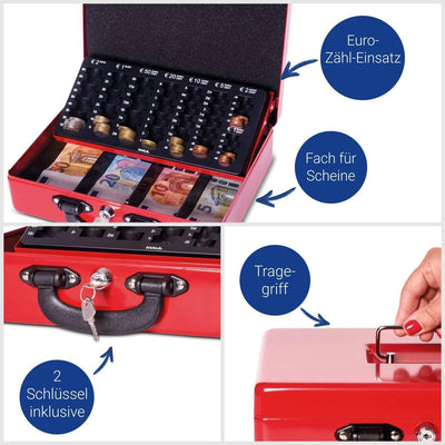 - Die Geldkassette ist aus nahtlos gezogenem, lackiertem Stahl gefertigt und mit einem praktischen Münzzählbrett ausgestattet.