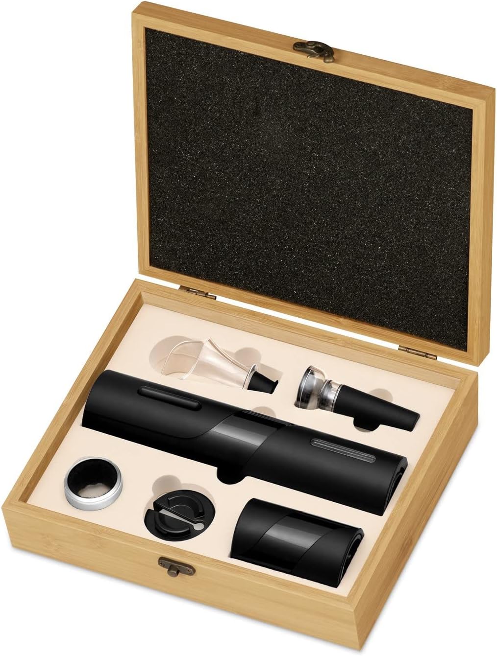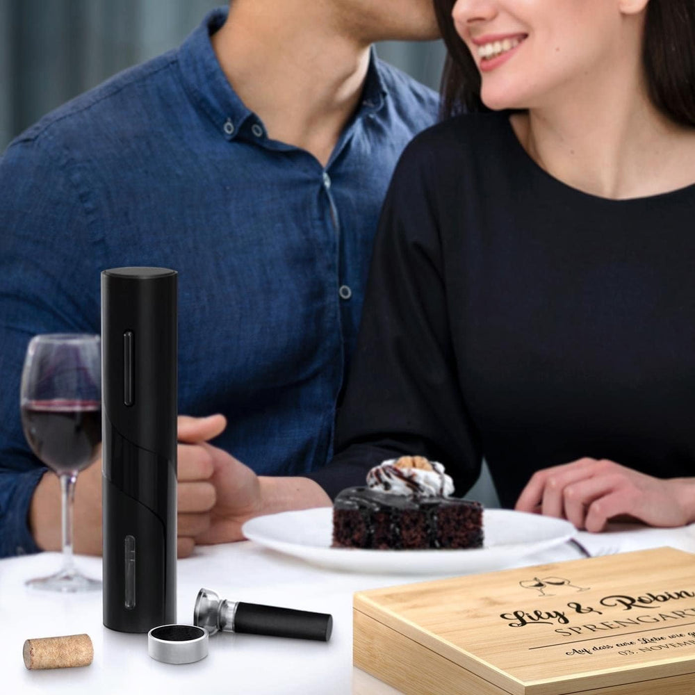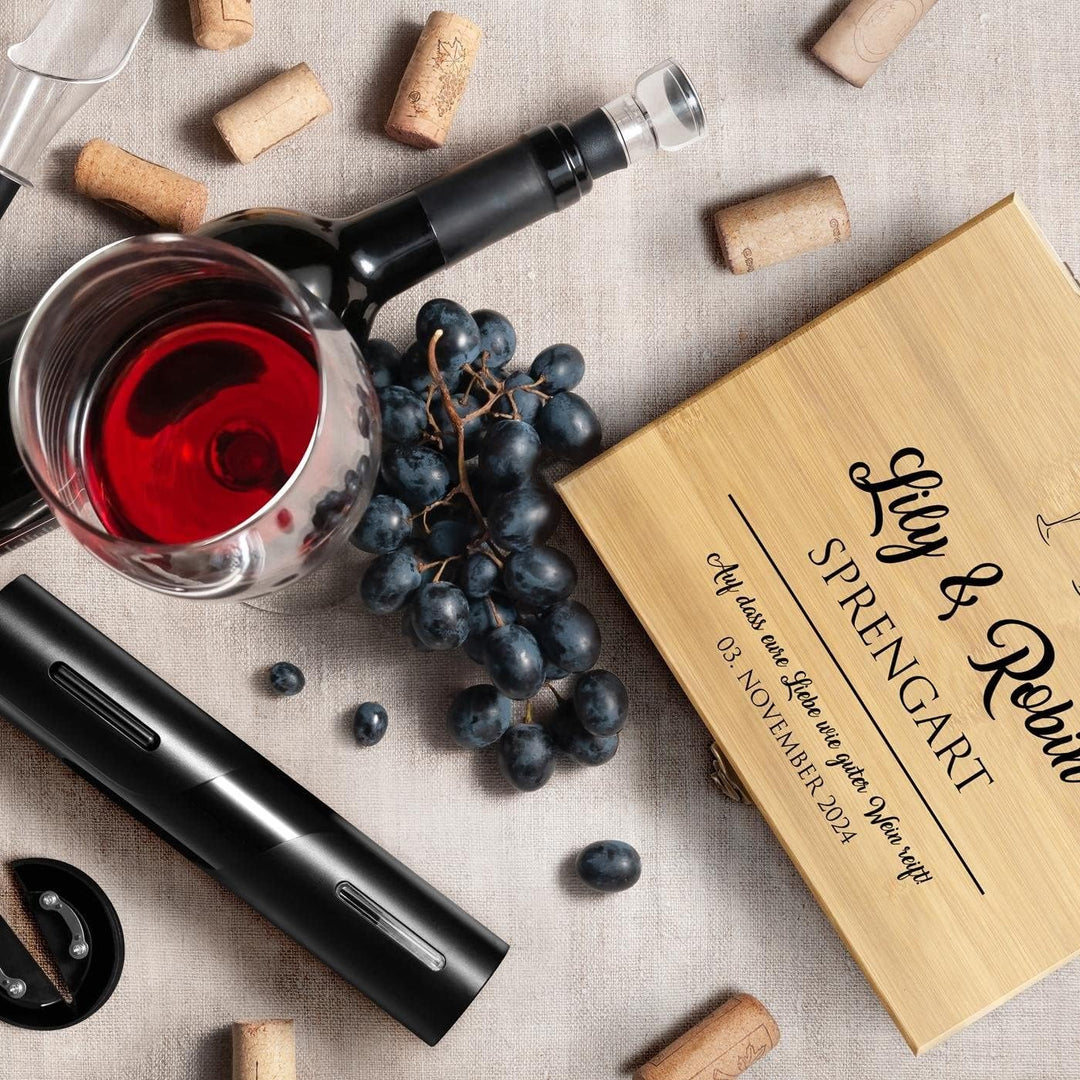- STILVOLLES GESCHENKSET: das dekorative, rustikale Weinset mit personalisiertem Aufdruck, weichem beigem Velours-Innenfutter und dem schönen Öffnungs- und Schliessmechanismus. Es beinhaltet einen elektrischen Korkenzieher, modernen Bieröffner,