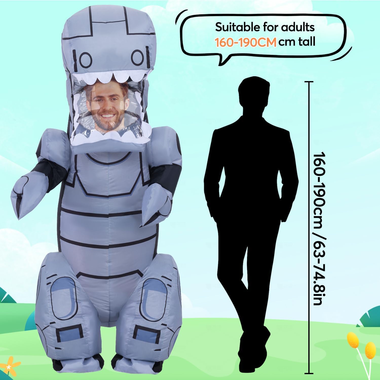 - Erwachsene Dinosaurier Kostüm: für Erwachsene Unisex von 150 cm bis 190 cm. (4,9 Fuss bis 6,2 Fuss). Mit Aufblasbaren Halloween Kostüm Wirst du zum Gruseligen Dinosaurier, der auf der Strasse läuft und alle Blicke auf sich zieht.