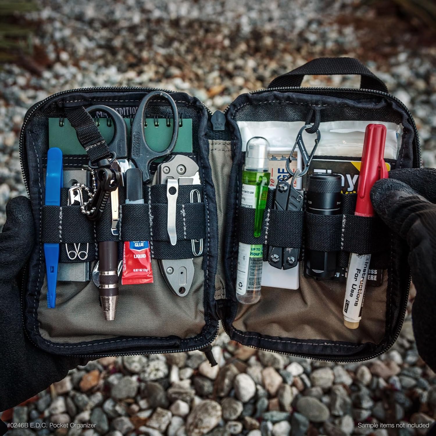 - Vorne aussen: 5,1 x 7,6 cm Schlaufenfeld für Patches; Netz-Einstecktasche mit Klettverschluss