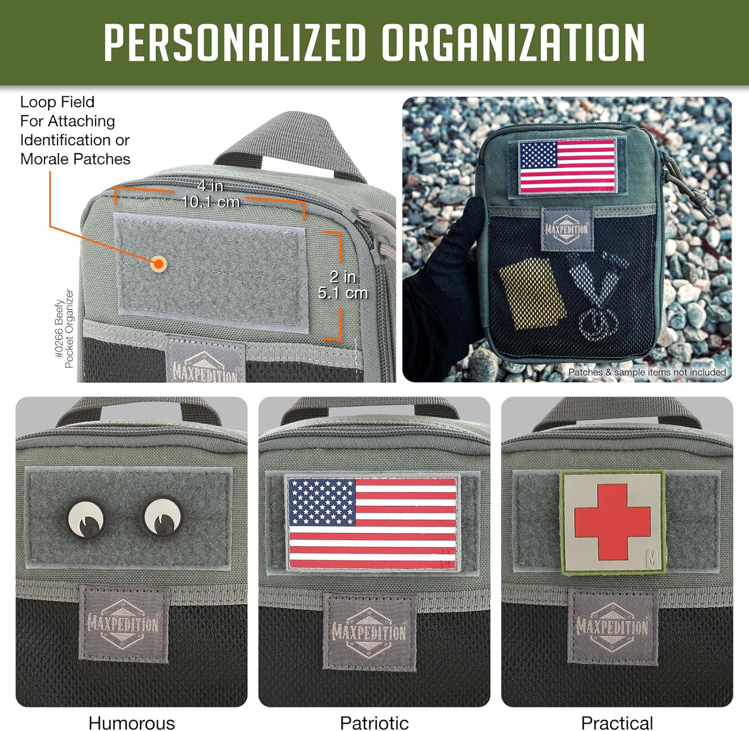 - Äussere Vorderseite: Eine (1) 14 cm (L) x 13 cm (H)grosse Netztasche und ein Schlaufen-Fach für ein Ausweis-Patch