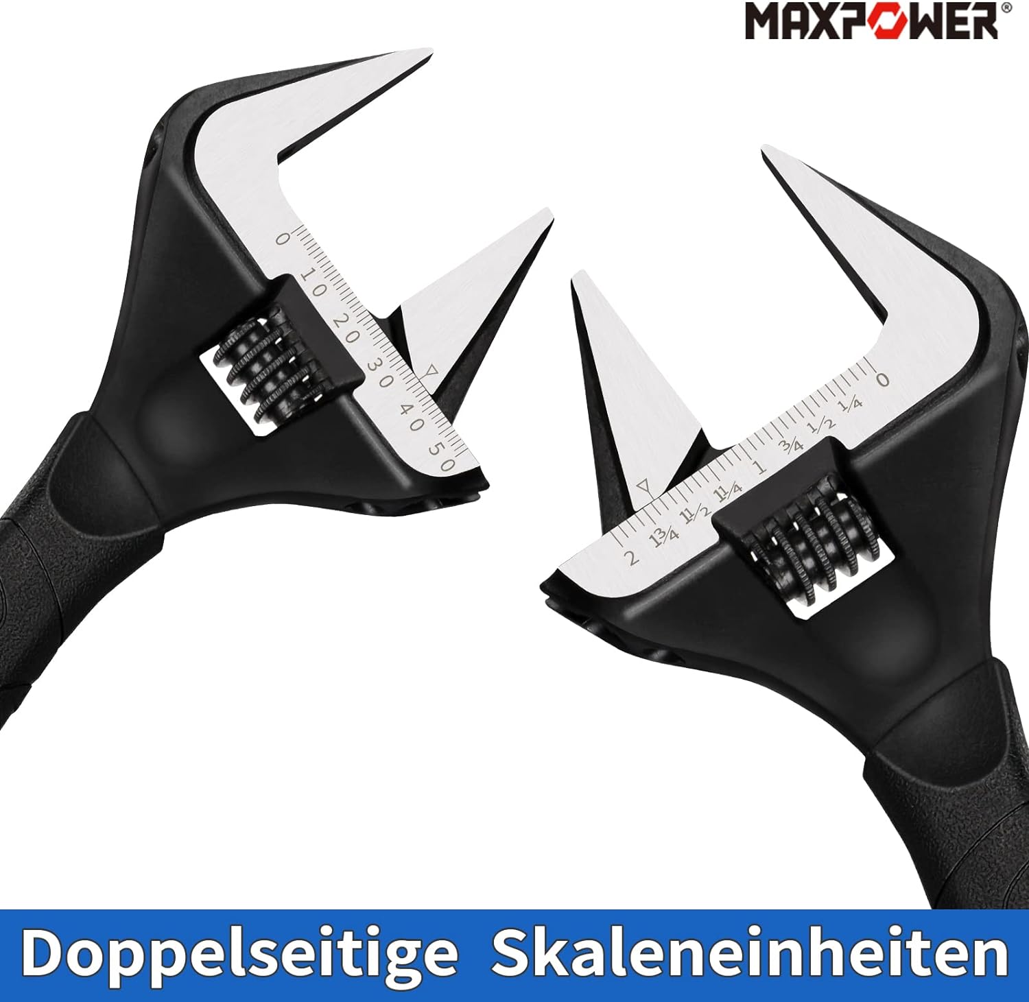- Technische Daten, Zweierpack-Schraubenschlüssel. Es handelt sich um 150 mm bzw. 250 m verstellbare Schraubenschlüssel mit einer maximalen Öffnung von 36 mm bzw. 52 mm.