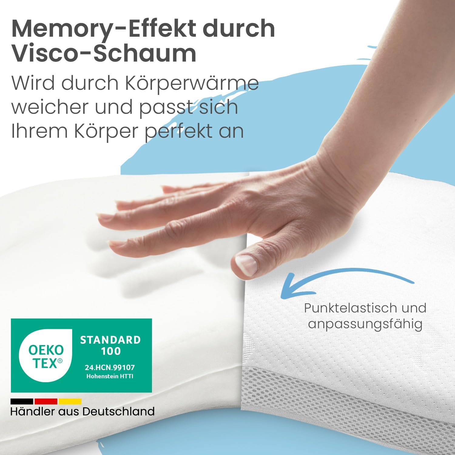 - Schlafkissen aus druckentlastendem Viskoschaum: Visko (Memory foam) passt sich dem gesamten Körper perfekt an, bietet idealen Halt und stützt den Nacken, die Schultern und den Rücken. Durch die ergonomische Form ist das Kissen ideal für Bauch-,
