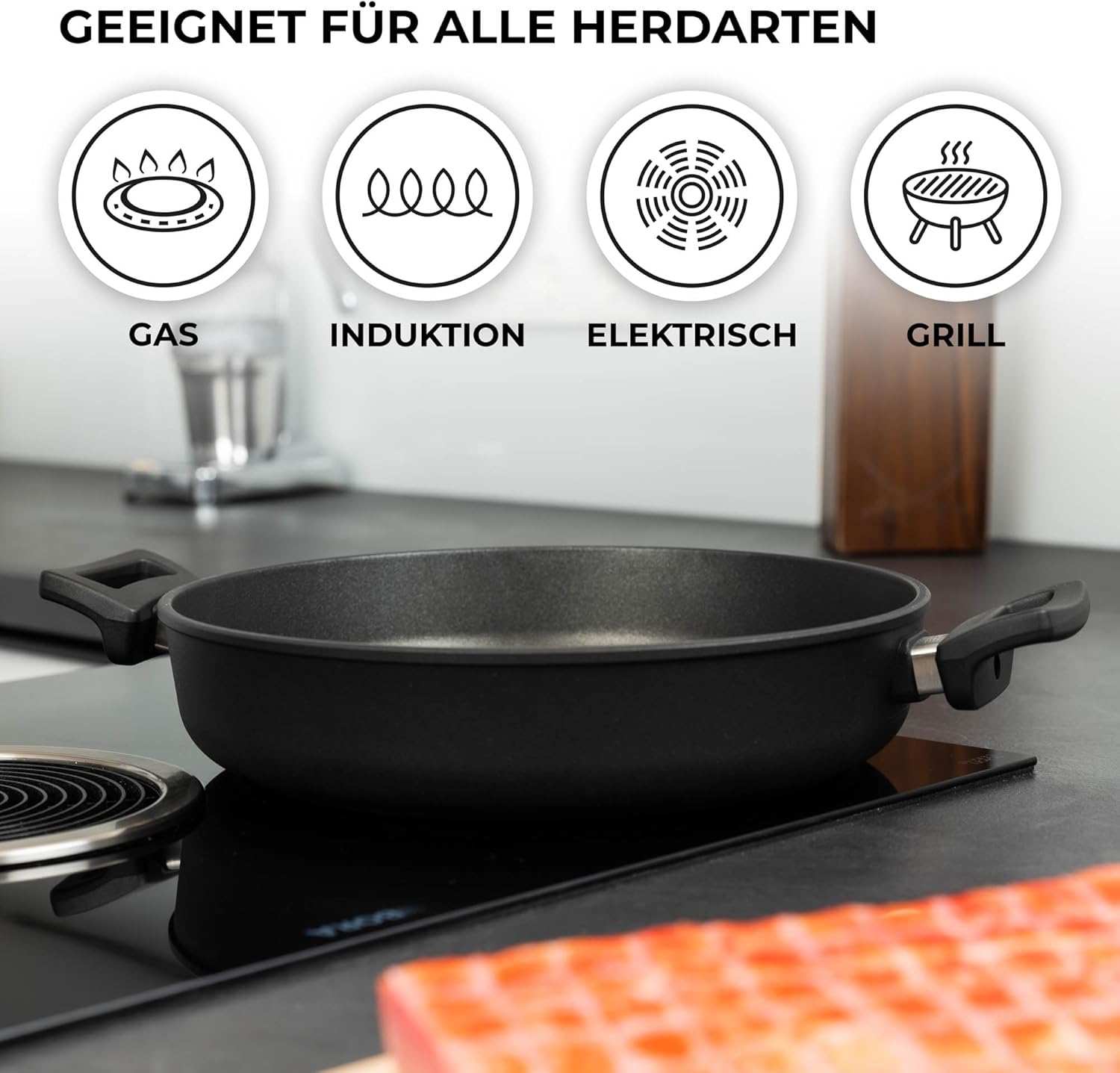 - [DEUTSCHE HANDARBEIT]: Unser Bratentopf, gefertigt aus einer hochwertigen Aluminiumlegierung, wird im traditionellen Kokillenhandguss Verfahren in Deutschland hergestellt. Dieses aufwendige Handwerk garantiert Qualität, Langlebigkeit und