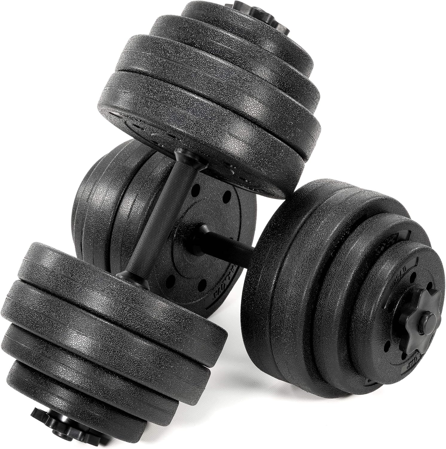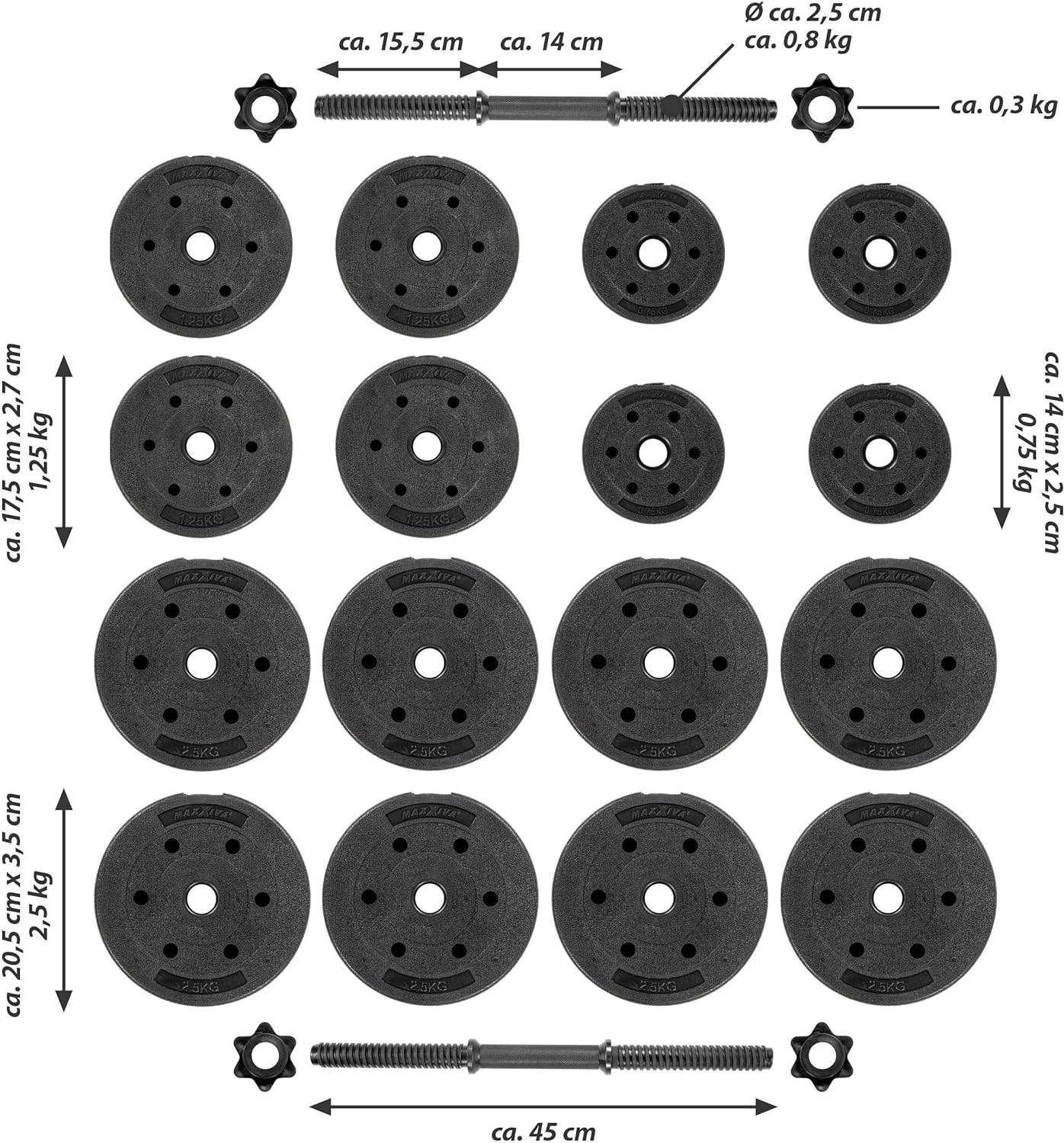 • 2er Set Kurzhantelstangen aus hochwertigem Kunststoff inklusive 4 x Sternverschlüsse mit 8 x 2.5 kg, 4 x 1.25 kg und 4 x 0.75 kg Hantelscheiben.