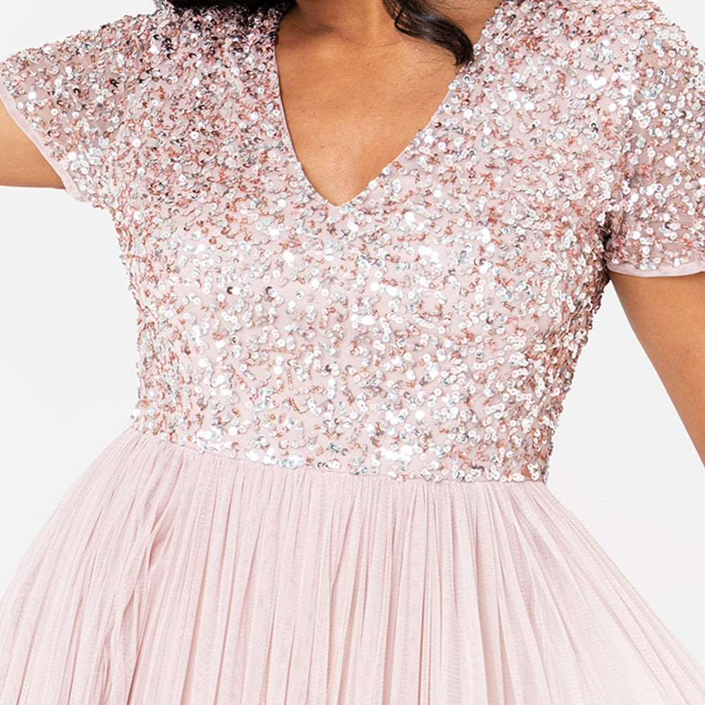 PRODUKTBESCHREIBUNGEN Feel elegant in this short sleeve maxi dress from Maya Deluxe perfect for summer events. Matching hand-sewn sequin embellishment is drenched over the fitted bodice and long sleeves that are layered with extra tulle fabric for comfortable wear. Features a chic boat neckline and a floor-sweeping soft tulle skirt that flairs from the waist giving the dress a romantic finish This gown is one of our most popular styles for bridesmaids. These dresses are ideal for all kinds of occasions: weddings, birthday parties, formal evening parties, homecoming, graduation proms, balls, New Year’s Eve parties, romantic dinners or as a gift for someone you love. Feel like a princess in that evening dress during your most important life events. These beautiful dresses feature:-Long sleeves -Sequin bodice -Boat neck -Invisible zip fastening -Maxi length -Body Lined -Tulle Overlay Comes in a range of colours: Dusty Blue, Misty Green, Green Lily, Soft Grey, Berry, Frosted Pink, Taupe Blue and Pale Mauve and 12 UK sizes Mehr