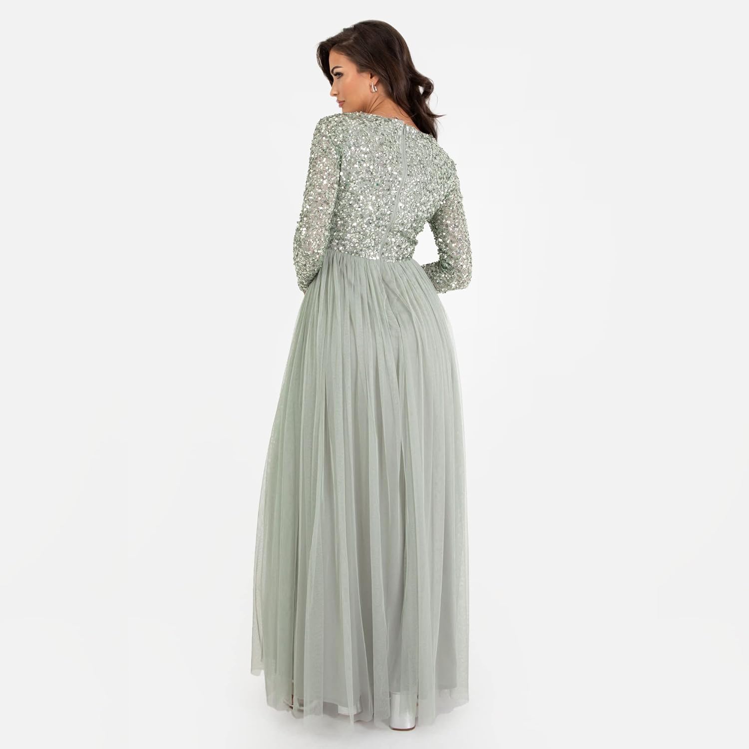 PRODUKTBESCHREIBUNGEN Dieses Chiffonkleid von Maya Deluxe mit langen Ärmeln ist ein elegantes Kleid, das perfekt zu herbstlichen und winterlichen Anlässen passt. Passende handgenähte Paillettenverzierungen überziehen das taillierte Oberteil mit Rundhals-Ausschnitt, das für einen hohen Tragekomfort mit zusätzlichem Tüllstoff überlagert sind. Das Kleid mit Paillettenverzierungen am Oberteil hat einen wallenden Rock aus weichem Tüll, der ab der Taille ausgestellt ist und dem Kleid ein romantisches Finish verleiht. Cocktailkleider Damen elegant - Dieses Kleid ist eines unserer beliebtesten Modelle für Brautjungfern. Diese Festkleider für Damen sind ideal für alle Arten von Anlässen: Als Hochzeitsgastkleid, Trauzeuginnen Kleid, für Geburtstagsfeiern, formelle Abendveranstaltungen, als Abschlussballkleid, Cocktail Kleid für Silvesterpartys, für romantische Abendessen oder als Geschenk für eine Person, die Ihnen am Herzen liegt. Fühlen Sie sich in diesem bei Ihren wichtigsten Momenten im Leben wie eine Prinzessin. Wunderschöne Party Kleider Damen mit folgenden Eigenschaften: Rundhals-Ausschnitt, Pailletten-Oberteil, A-Schnitt-Passform, unsichtbarer Reissverschluss, Midi-Länge, überlagerter Body, Tüll-Overlay. Erhältlich in einer Reihe von Farben: Pink, Blau und Grün - in 12 verschiedenen Grössen: 34, 36, 38, 40, 42, 44, 46, 48, 50, 52, 54, 61This Maya Deluxe chiffon dress with long sleeves is an elegant dress that fits perfectly on autumn and winter occasions. Matching hand-sewn sequin embellishments cover the fitted top with crew neck, which are overlaid with additional tulle fabric for a high level of comfort. The dress with sequin embellishments on the top has a fluffing skirt made of soft tulle that is flared from the waist and gives the dress a romantic finish. Women's elegant cocktail dresses - This dress is one of our most popular models for bridesmaids. These party dresses for women are ideal for all kinds of occasions: as wedding guest dress, maid of honour dress, birthday parties, formal evening events, prom dress, cocktail dress for New Year's Eve parties, romantic dinners or as a gift for a person you care about. Feel like a princess at your most important moments in life. Beautiful party dresses women with the following features: round neck, sequin top, A-cut fit, invisible zip, midi length, overlaid bodysuit, tulle overlay. Available in a range of colours: pink, blue and green - in 12 different sizes: 34, 36, 38, 40, 42, 44, 46, 48, 50, 52, 54, 61 Mehr