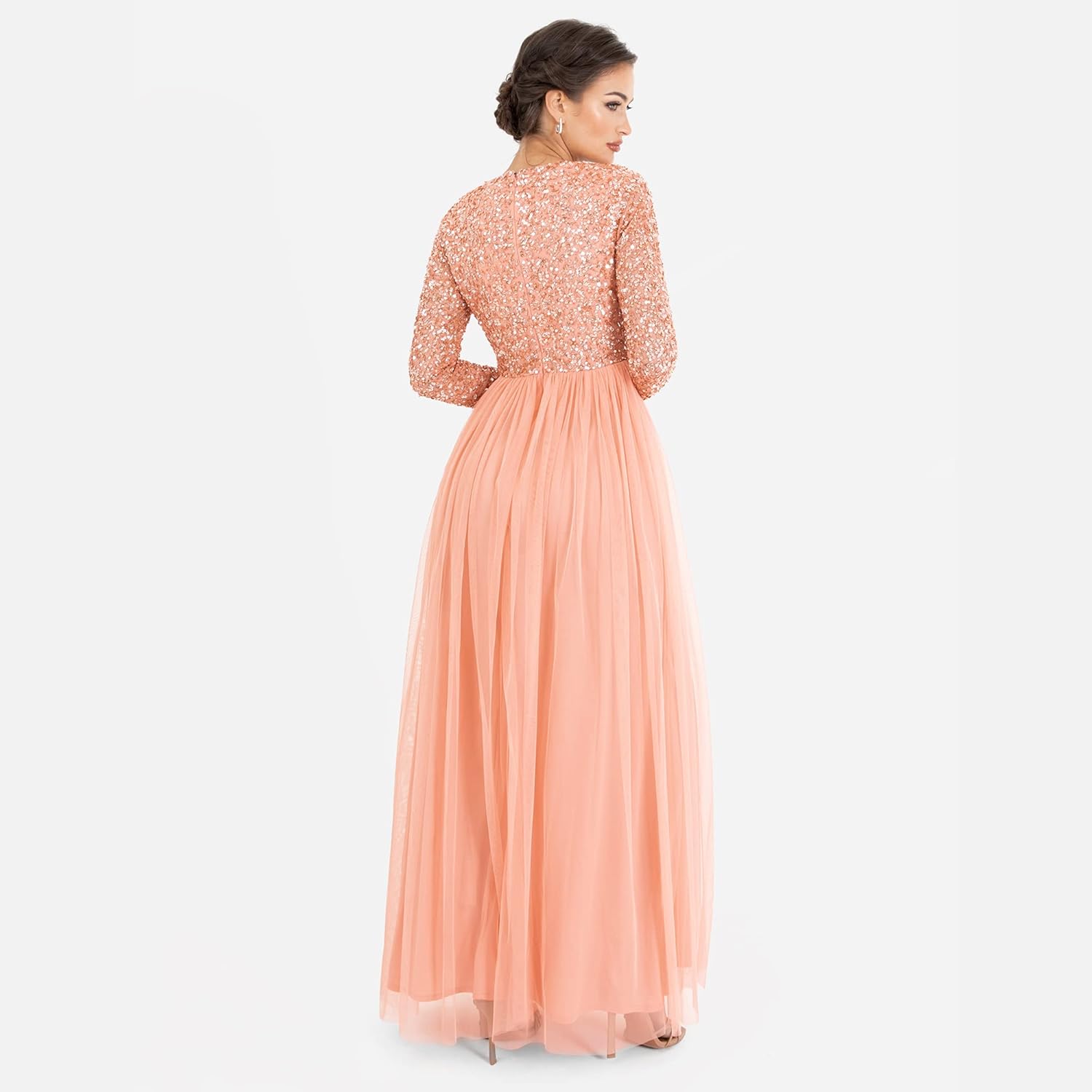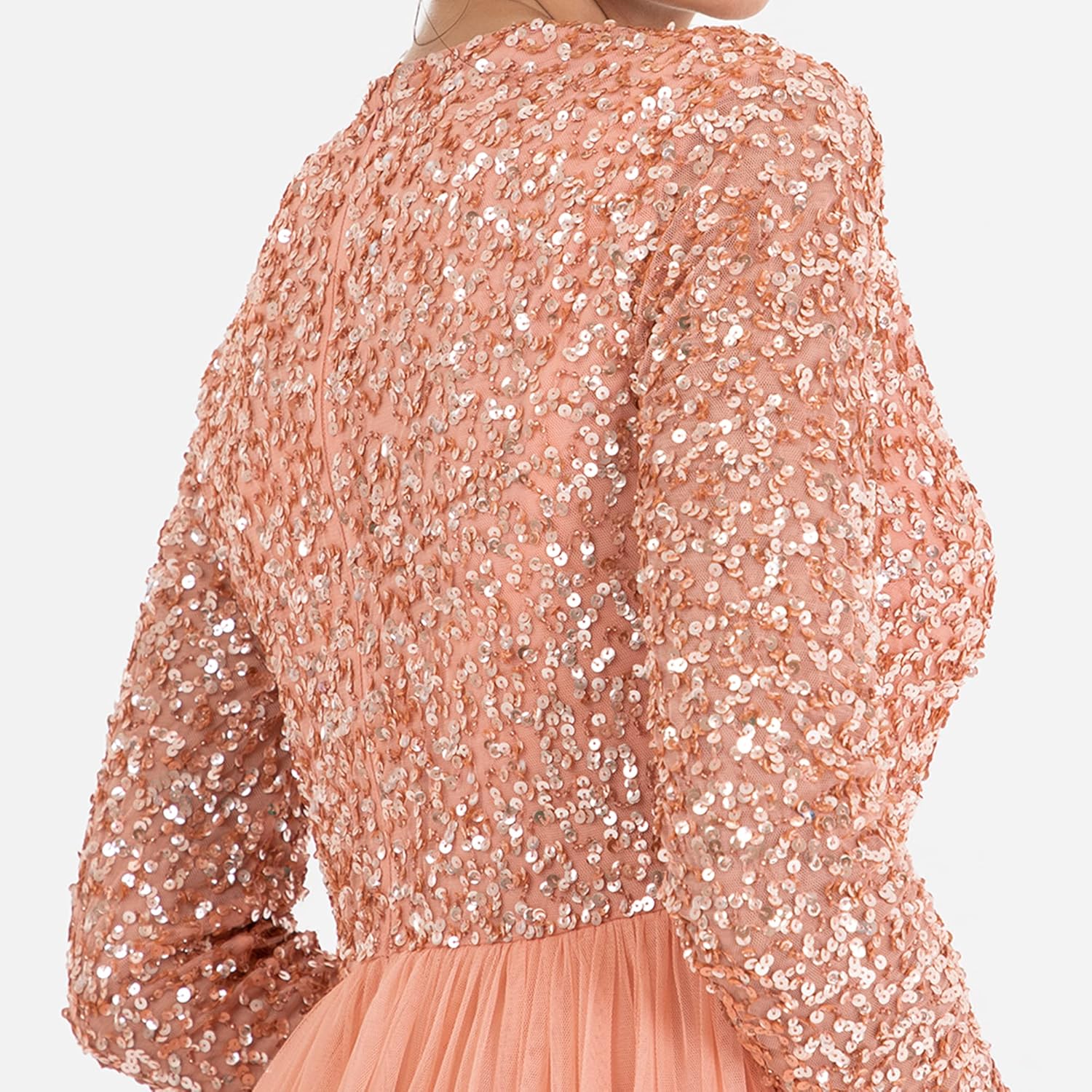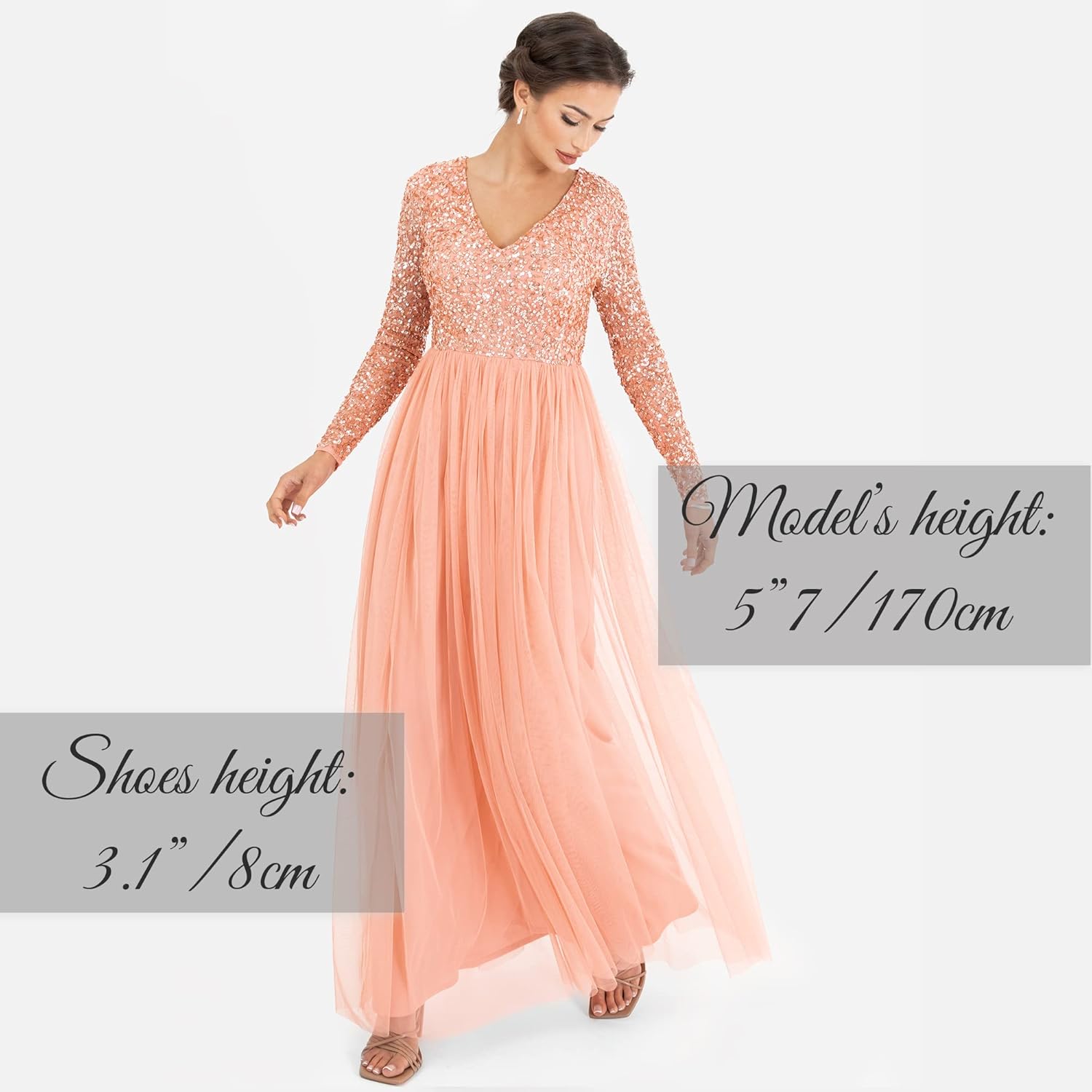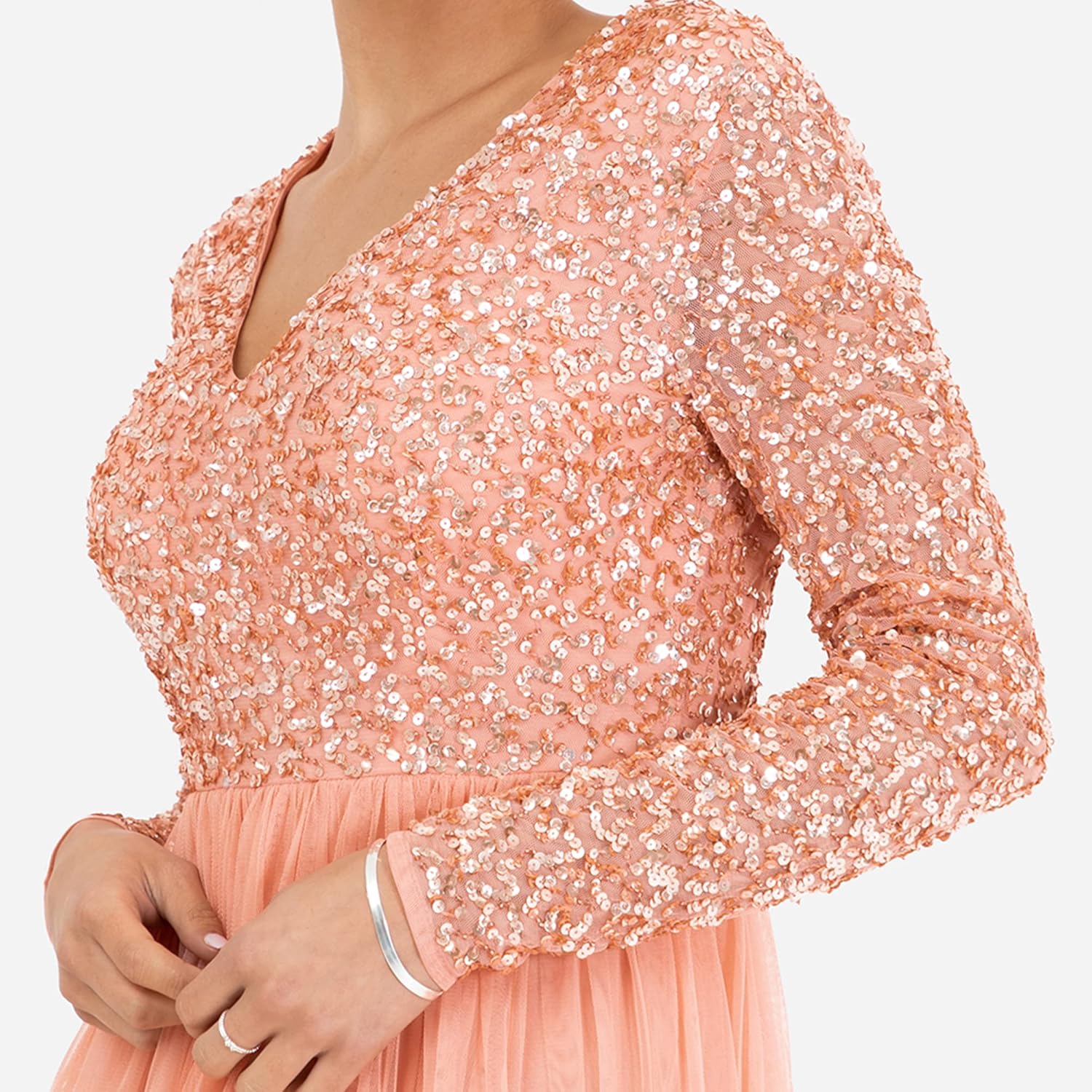 PRODUKTBESCHREIBUNGEN Dieses Chiffonkleid von Maya Deluxe mit langen Ärmeln ist ein elegantes Kleid, das perfekt zu herbstlichen und winterlichen Anlässen passt. Passende handgenähte Paillettenverzierungen überziehen das taillierte Oberteil mit Rundhals-Ausschnitt, das für einen hohen Tragekomfort mit zusätzlichem Tüllstoff überlagert sind. Das Kleid mit Paillettenverzierungen am Oberteil hat einen wallenden Rock aus weichem Tüll, der ab der Taille ausgestellt ist und dem Kleid ein romantisches Finish verleiht. Cocktailkleider Damen elegant - Dieses Kleid ist eines unserer beliebtesten Modelle für Brautjungfern. Diese Festkleider für Damen sind ideal für alle Arten von Anlässen: Als Hochzeitsgastkleid, Trauzeuginnen Kleid, für Geburtstagsfeiern, formelle Abendveranstaltungen, als Abschlussballkleid, Cocktail Kleid für Silvesterpartys, für romantische Abendessen oder als Geschenk für eine Person, die Ihnen am Herzen liegt. Fühlen Sie sich in diesem bei Ihren wichtigsten Momenten im Leben wie eine Prinzessin. Wunderschöne Party Kleider Damen mit folgenden Eigenschaften: Rundhals-Ausschnitt, Pailletten-Oberteil, A-Schnitt-Passform, unsichtbarer Reissverschluss, Midi-Länge, überlagerter Body, Tüll-Overlay. Erhältlich in einer Reihe von Farben: Pink, Blau und Grün - in 12 verschiedenen Grössen: 34, 36, 38, 40, 42, 44, 46, 48, 50, 52, 54, 61This Maya Deluxe chiffon dress with long sleeves is an elegant dress that fits perfectly on autumn and winter occasions. Matching hand-sewn sequin embellishments cover the fitted top with crew neck, which are overlaid with additional tulle fabric for a high level of comfort. The dress with sequin embellishments on the top has a fluffing skirt made of soft tulle that is flared from the waist and gives the dress a romantic finish. Women's elegant cocktail dresses - This dress is one of our most popular models for bridesmaids. These party dresses for women are ideal for all kinds of occasions: as wedding guest dress, maid of honour dress, birthday parties, formal evening events, prom dress, cocktail dress for New Year's Eve parties, romantic dinners or as a gift for a person you care about. Feel like a princess at your most important moments in life. Beautiful party dresses women with the following features: round neck, sequin top, A-cut fit, invisible zip, midi length, overlaid bodysuit, tulle overlay. Available in a range of colours: pink, blue and green - in 12 different sizes: 34, 36, 38, 40, 42, 44, 46, 48, 50, 52, 54, 61