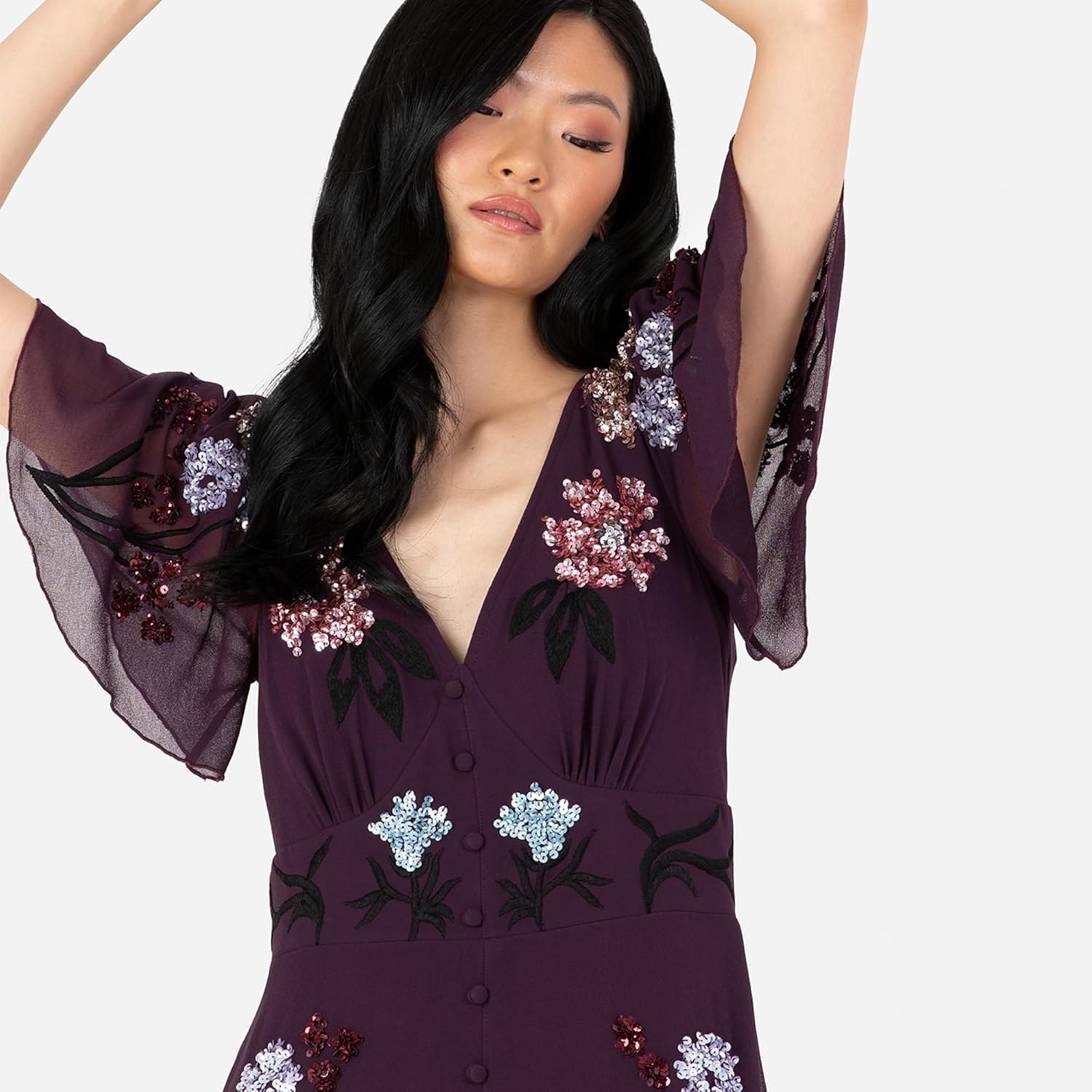 PRODUKTBESCHREIBUNGEN Feel elegant in this short sleeve maxi dress from Maya Deluxe, perfect for summer events. This evening dress features hand embellished sequins and embroidery detail, and has a chic V-neckline with an A-line silhouette. Featuring a concealed zip for easy wear, the maxi dress is finished with elegant flutter sleeves. This maxi dress is one of our most popular styles for bridesmaids. These women's dresses are ideal for all kinds of occasions: weddings, birthday parties, formal evening parties, homecoming, graduation proms, balls, New Year’s Eve parties, romantic dinners or as a gift for someone you love. Feel like a princess in that occasion dress during your most important life events. These beautiful evening dresses feature: - Flutter sleeves - Hand embellished sequins -V-neck - Embroidered - Maxi length - Body Lined -A-line. Available in Red Berry, these evening dresses for ladies come in 12 EU sizes: 34, 36, 38, 40, 42, 44, 46, 48, 50, 52, 54, 56.
