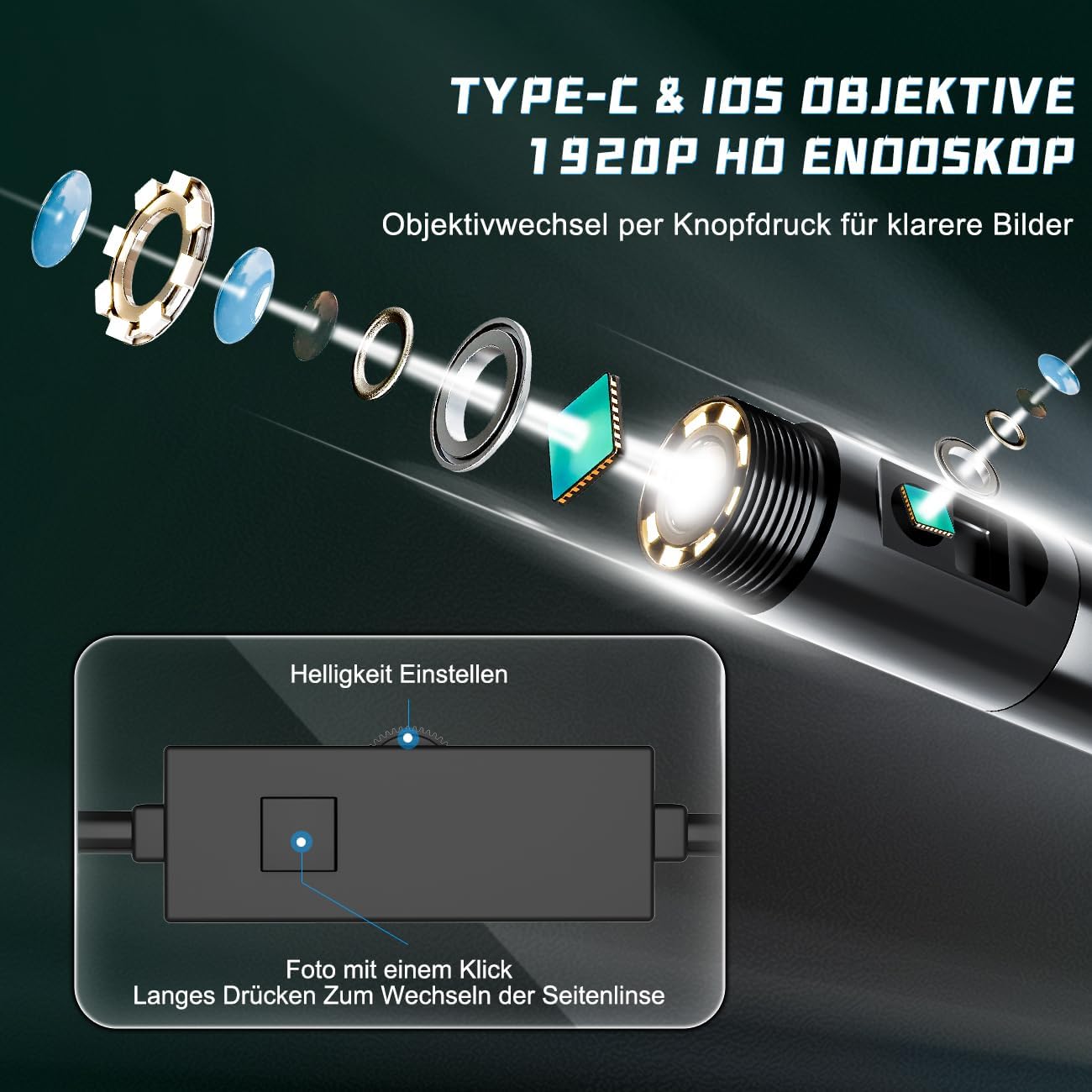 - 【2-in-1 Hohe Kompatibilität】Endoskop Kamera mit Licht iphone kommt mit Type-C, Lightning 2 In 1 Adapter Stromversorgungsschnittstelle, Diese Endoskop Kamera funktioniert mit iPhone mit iOS 9+ System und Type C Schnittstelle Samsung Telefone. Suchen