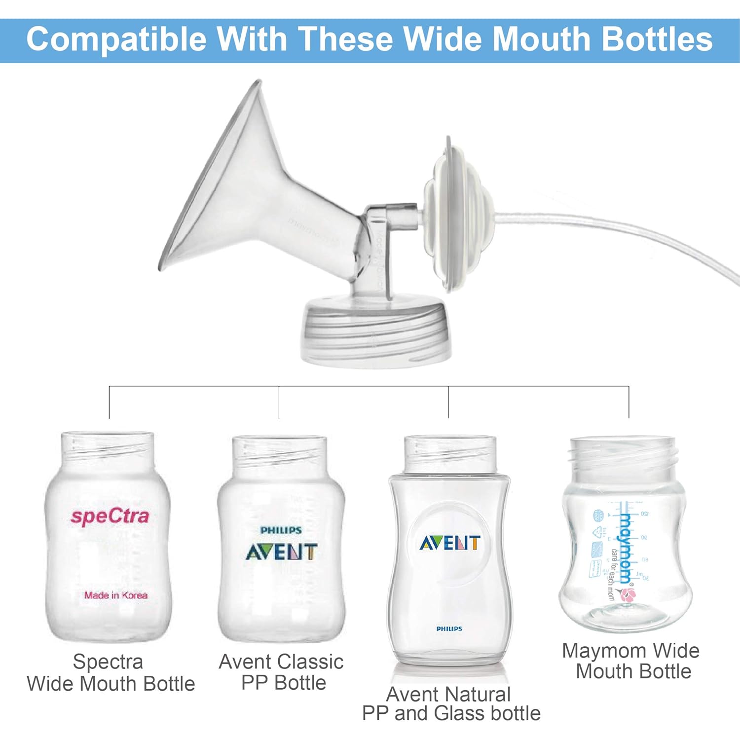 - NUR BEI FLASCHEN MIT BREITEM MUND ZU VERWENDEN. Verwenden Sie dieses Kit mit Spectra-Flaschen, Kompatibel mit Avent-Flaschen und Maymom-Weitmundflaschen. Funktioniert NICHT mit ANDEREN WEITHALS-FLASCHEN. GESCHLOSSENES SYSTEM. Kein Kontakt zwischen Milch