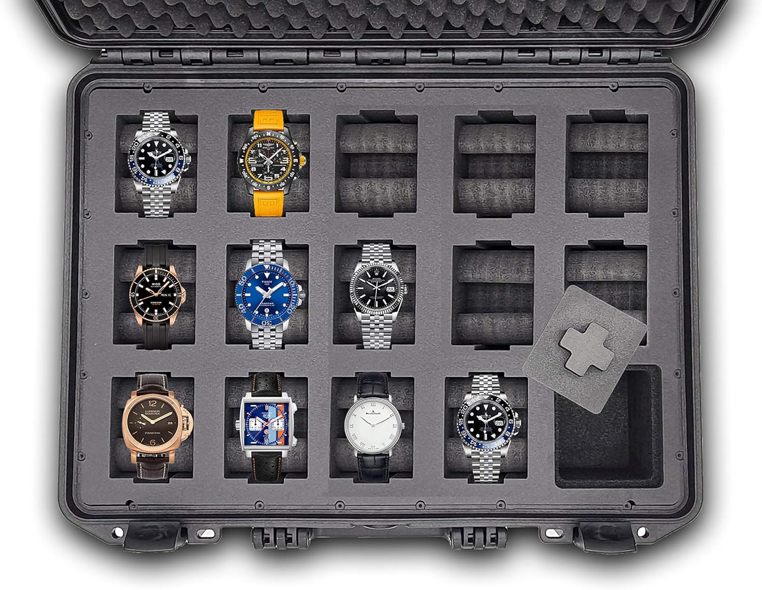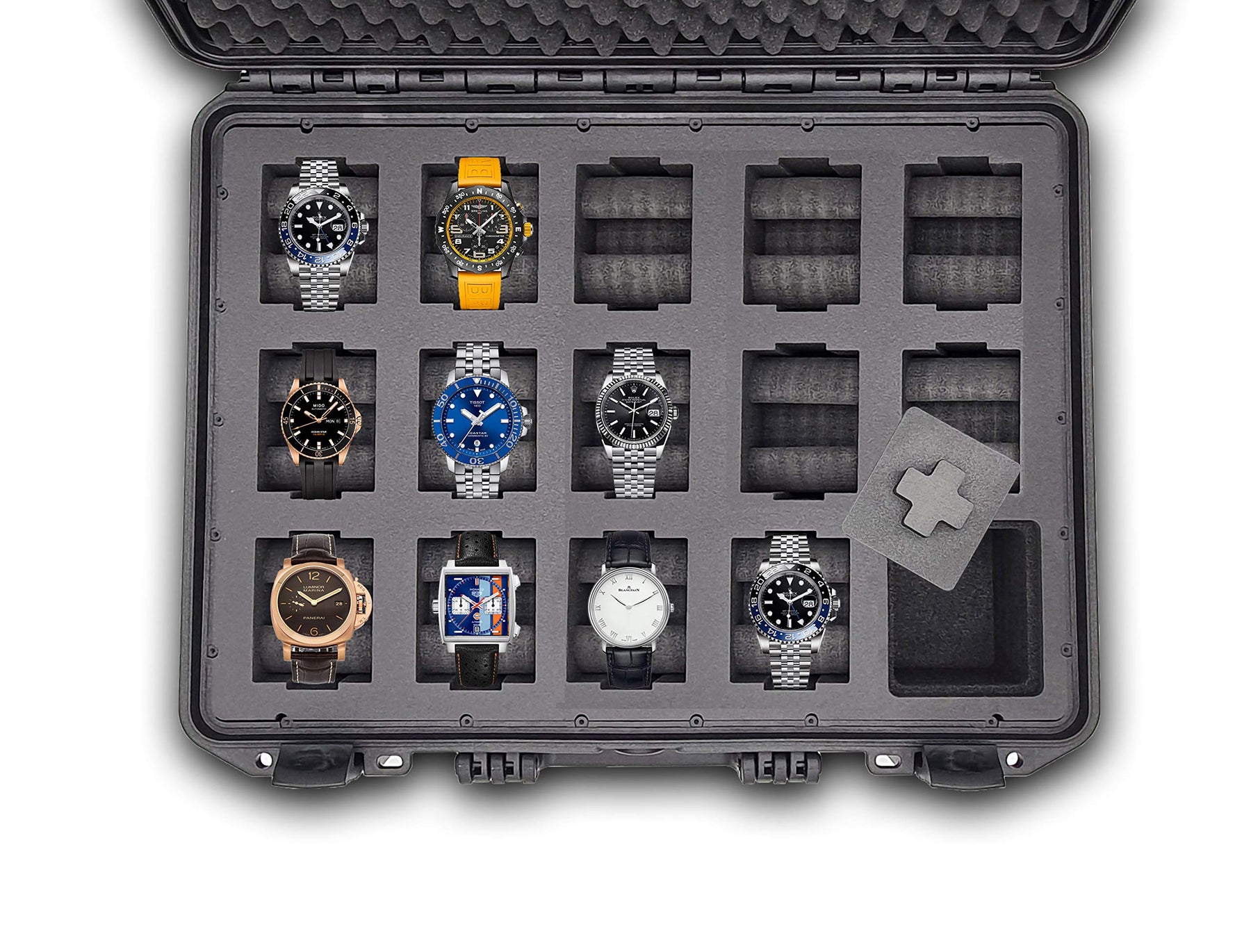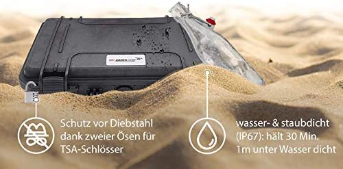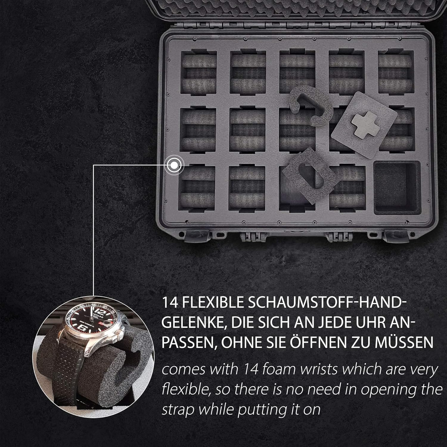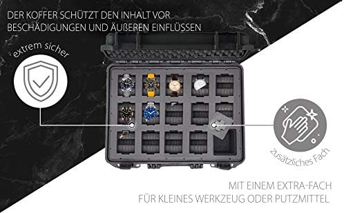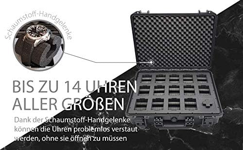 PRODUKTBESCHREIBUNGEN ⭐ Extrem sicherer Transportkoffer für bis zu 14 Uhren. Robust, Sicher, modulierbar, abschliessbar! Made Munich, Germany. 💡 Spezialschaumstoff: Das Innenleben des Koffers besteht aus hochwertigem, robustem und langlebigem Spezial-Formschaumstoff; ideal für empfindliche und filigrane Elemente! Ganz gleich ob Sie Uhren mit kurzem / langem Armband, grossem Gehäusering oder Uhren aus Materialien wie Edelstahl, Titan oder Goldlegierungen besitzen, die Uhren finden einen sicheren Platz im Koffer. Selbstverständlich entstehen keine Kratzer während des Transportes. ✔ Modulierbar für Ihre Bedürfnisse: Ein Uhrenfach kann alternativ als multifunktionelles Fach mit Deckel für Kleinteile, Zubehör, Putztücher o.Ä. genutzt werden. Ganz gleich ob Sie Uhren mit langem Armband, grossem Gehäusering oder Uhren aus Materialien wie Edelstahl, Titan oder Goldlegierungen besitzen, die Uhren finden einen sicheren Platz im Koffer. 🛡 Sicher: Extrem sicherer Transportkoffer für bis zu 14 Uhren. Ihre Uhren sind gegen äussere Einwirkungen (Wetter, Gewalt, Stoss, Sturz etc.) gesichert. Alle unsere Koffer sind nach IP67 geprüft und damit staub- und unterwasserdicht für bis zu 30 Minuten. Ein echtes Produkt „Made in Germany“ - Herstellung in Deutschland unter Berücksichtigung strenger Vorschriften für die schaumstoffverarbeitende Industrie 🔒 Abschliessbar: Der Koffer ist mittels TSA Schloss (nicht im Lieferumfang enthalten) über zwei Ösen abschliessbar. Perfekt zum Transport und Sichern von hochwertigen Uhren jeder Güteklasse. Markenprodukt by MC-CASES Gewicht: 2.9 Kg. Masse: 502 x 415 x H 141 mm. Deutsche Qualität, Deutscher Support. ☎