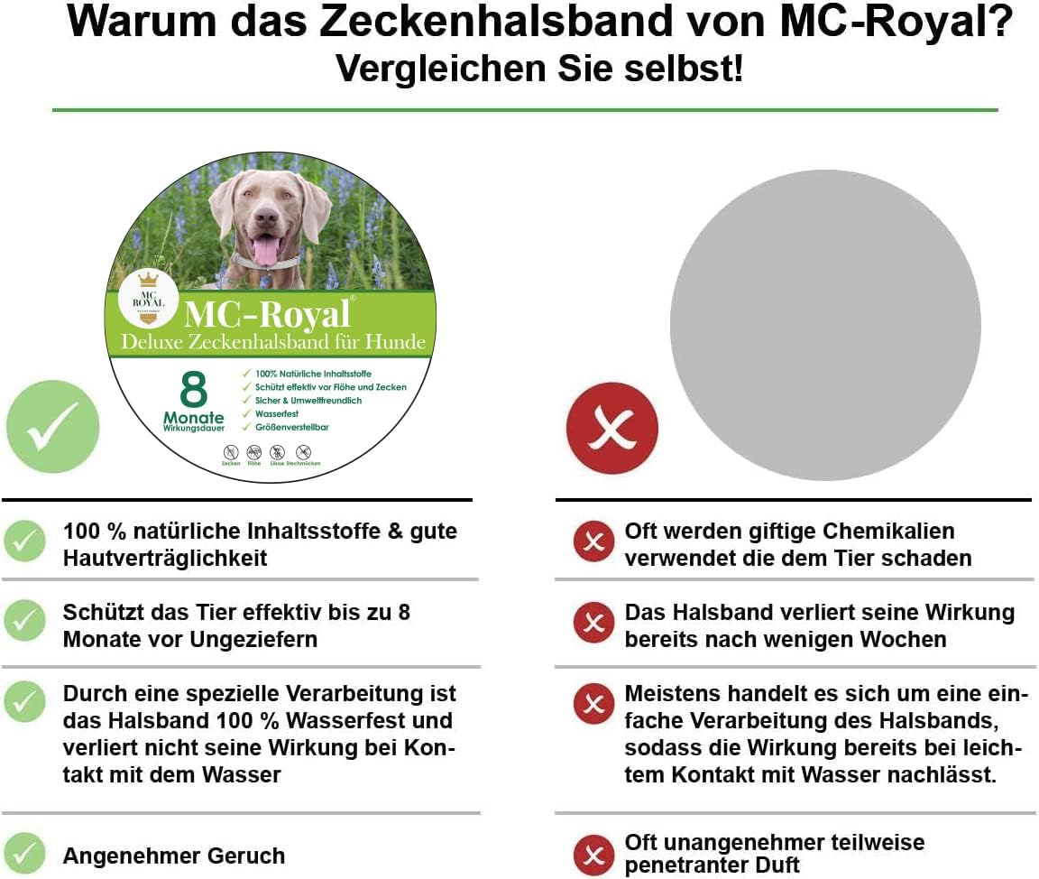 - 🐕 Neue Formel mit effektivem Schutz: Das MC-Royal Deluxe Zeckenhalsband wehrt effektiv schädliche Flöhe, Zecken, Flohlarven, Kauläuse und sarkoptische Mähne ab, sodass Ihr Hund 24/7 vor Ungeziefern zuverlässig geschützt bleibt.