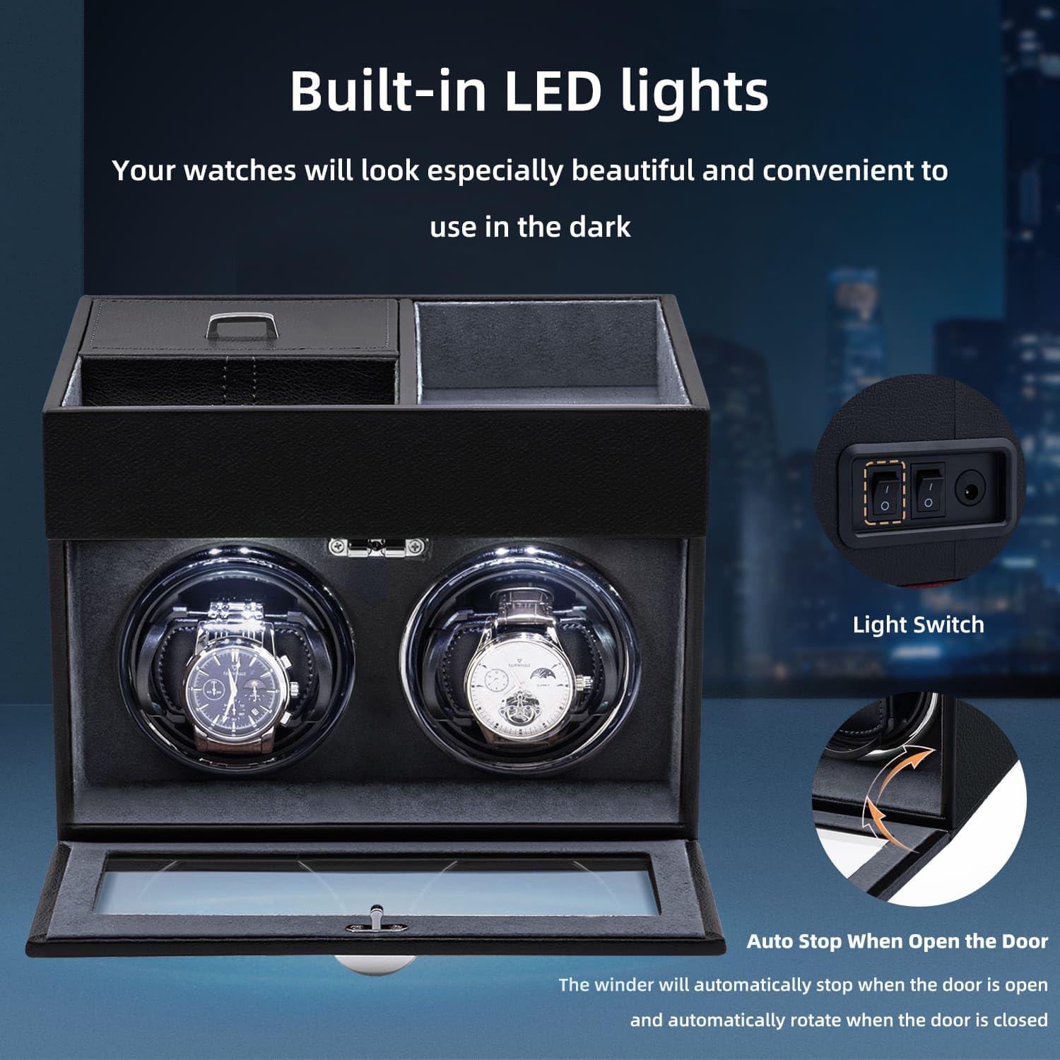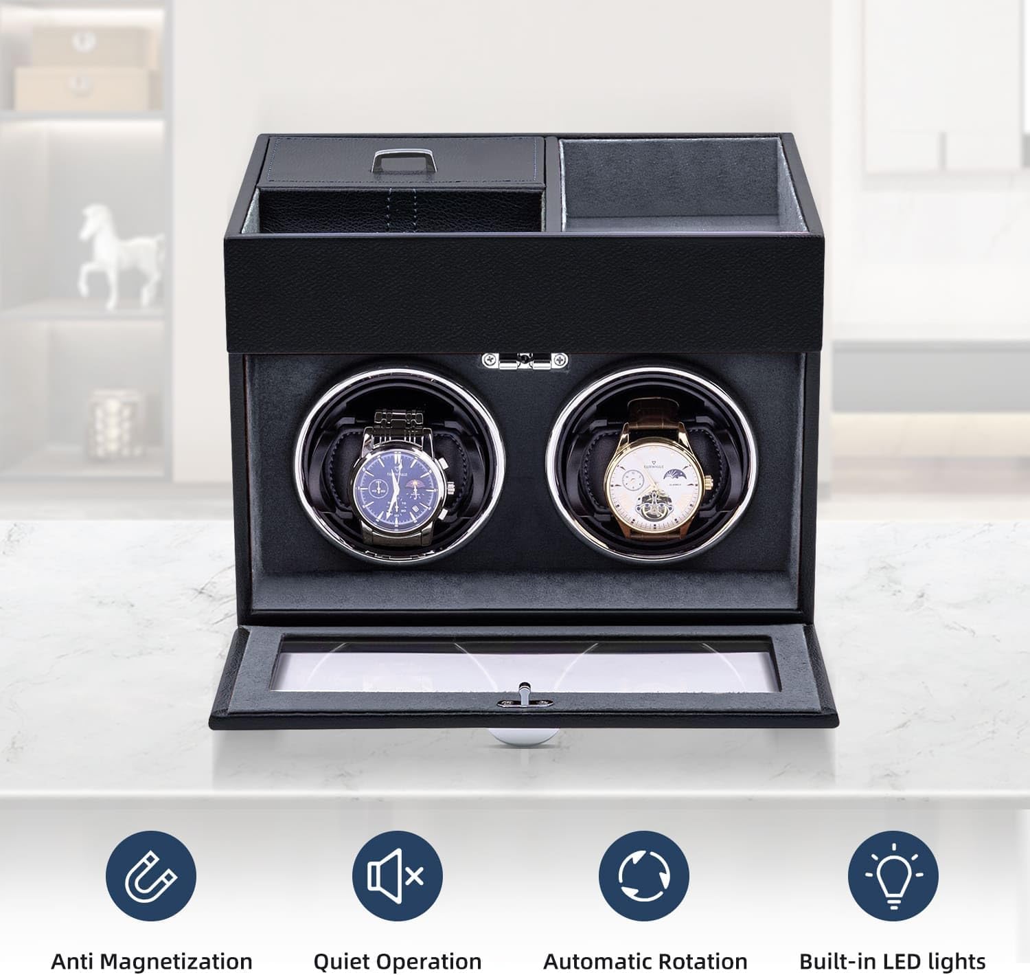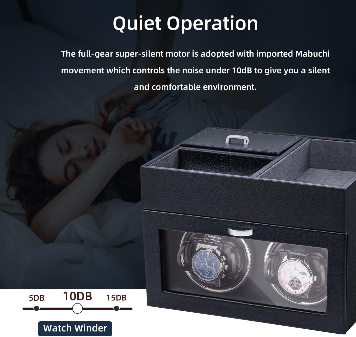 - Hohe Aufzieheffizienz: Der Uhrenbeweger für 2 Uhren ist mit einem japanischen leisen Mabuchi-Motor ausgestattet. Arbeitsmodus: 2 Minuten lang vorwärts drehen, 6 Minuten anhalten, 2 Minuten lang umdrehen, 6 Minuten anhalten und den Zyklus wiederholen.