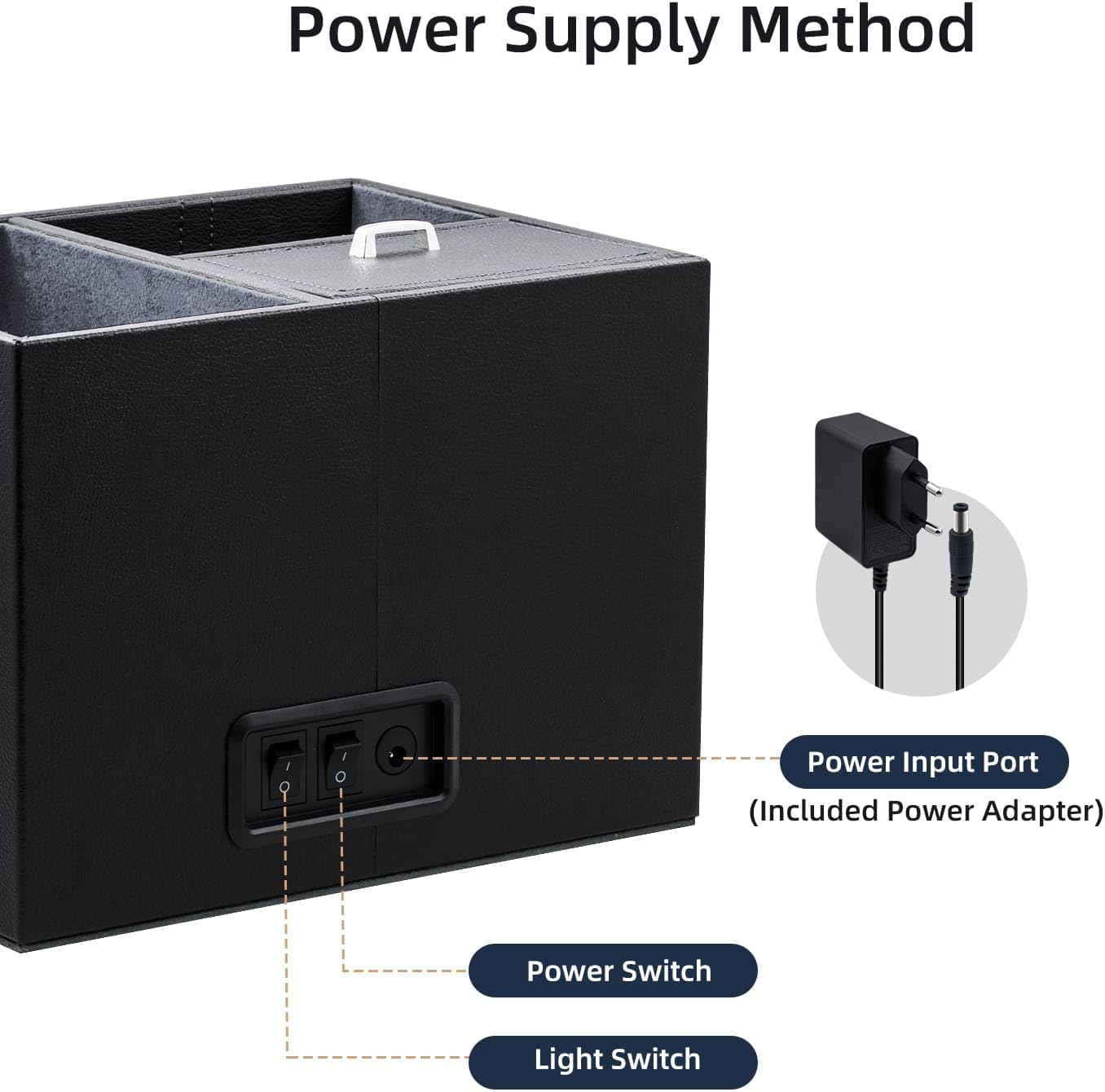 - LED-Umgebungslicht: Der Uhrenbeweger ist mit einem LED-Umgebungslicht ausgestattet, wodurch Ihre Uhr perfekt in der Wickelbox angezeigt wird und eine warme und einladende Atmosphäre für Ihren Raum schafft. Diese Lampe ist nicht nur funktional, sondern
