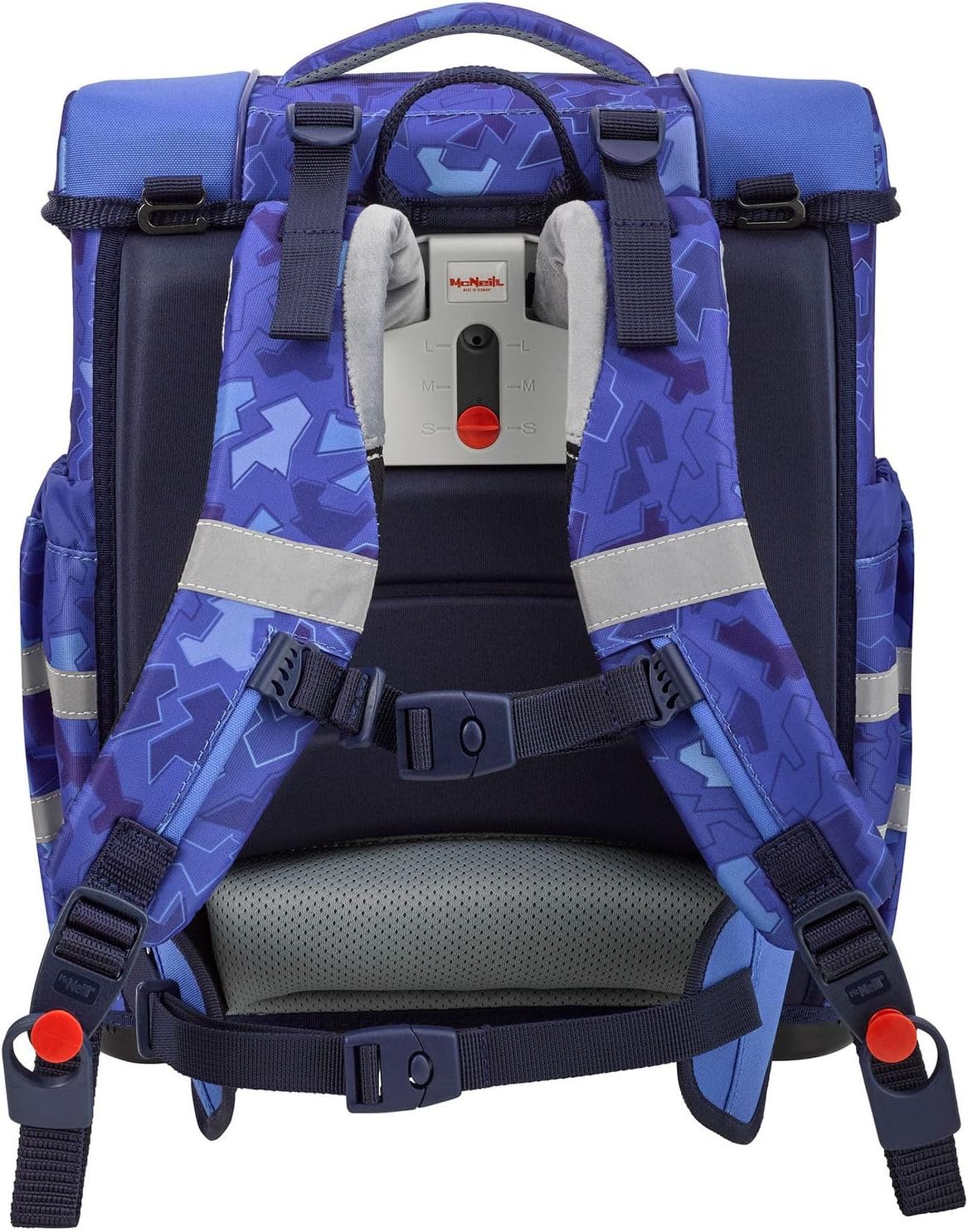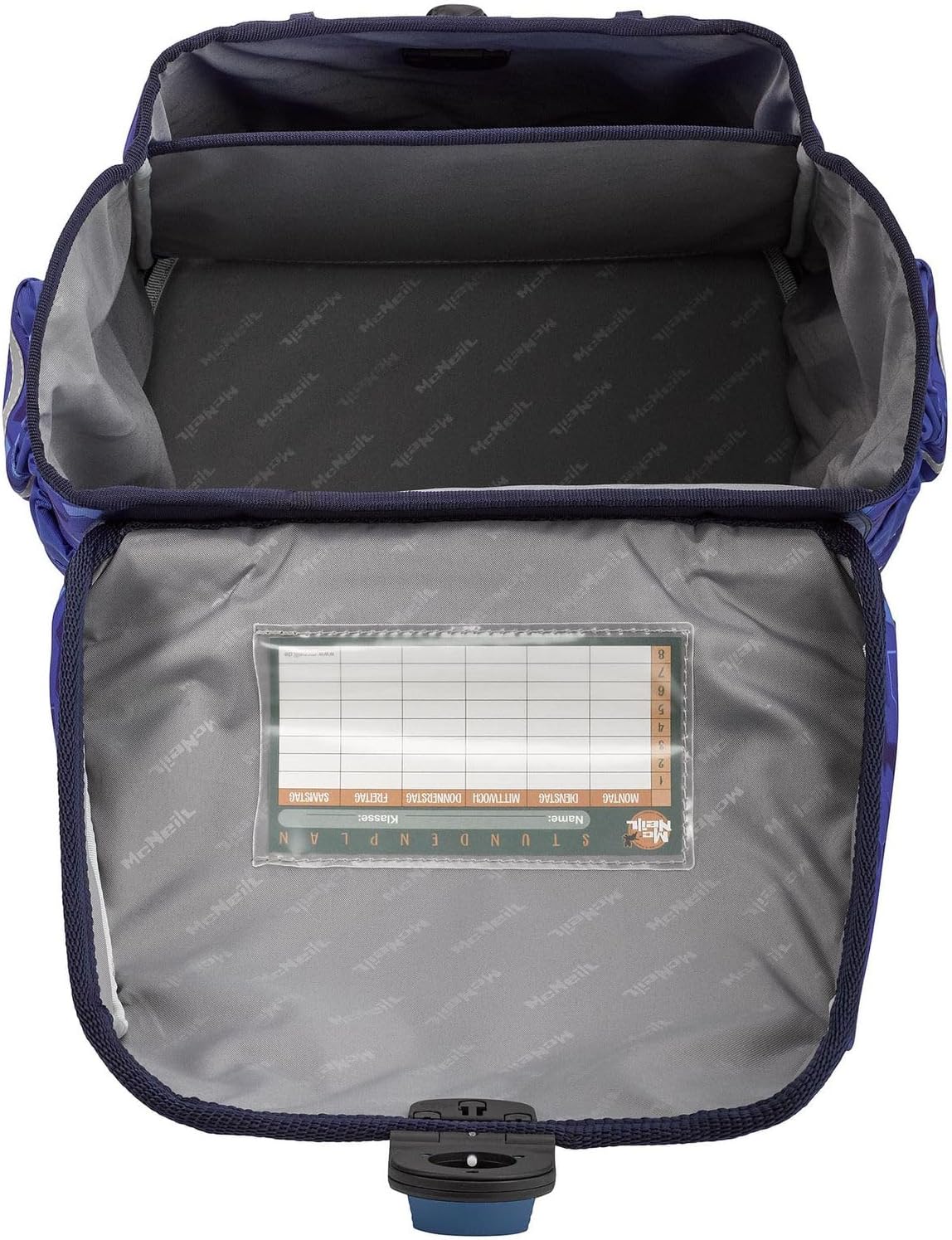 PRODUKTBESCHREIBUNGEN McNeill Schulranzen in einmaligem Muster Lieferumfang McNeill Set: o Schulranzen mit Etikett, Stundenplan, Beckenflosse, McTaggie o Schlüsselanhänger (Schlüsselanhänger) mit Etikett und Schlüsselring o Schlampermäppchen (Schlamperetui) mit Etikett o Federmäppchen (Federmäppchen) mit Etikett und Stundenplan, Geodreieck, Lineal, Radiergummi, Spitzer, Buntstift, Bleistift o Sportbeutel (Sportbeutel) mit Etikett Daten Schulranzen: o Masse: Breite ca. 30 cm, Höhe ca. 36 cm, Tiefe ca. 20 cm o Gewicht: ca. 1430 g o Volumen: ca. 18 l o Farbe: Puzzle (blau) o Auf der Oberseite 1 Tragegriff gepolstert: ca. 15 cm o Auf der Rückseite 1 Tragegriff verstärkt: ca. 15 cm o 2 Schultergurte ergonomisch geformt, atmungsaktiv, gepolstert, stufenlos verstellbar: ca. 35 cm - 70 cm o 1 Brustgurt stufenlos verstellbar: ca. 15 cm - 35 cm o 1 Beckenflosse, abnehmbar, gepolstert: ca. 55 cm o 1 Hüftgurt stufenlos verstellbar: ca. 20 cm - 50 cm o Material: Polyester o Lieferumfang: McNeill Schulranzen mit Etikett, 1 x Stundenplan, 1 x Beckenflosse, 1 x McTaggie, 1 x Trennwand Ausstattung Schulranzen: o Schulranzen wird mit Überschlagklappe und Magnetverschluss geschlossen o Im Hauptfach 1 Einschubfach, 1 herausnehmbare Trennwand und 1 elastische Trennwand o Auf der Oberseite 1 Magnetbefestigung für McTaggie o Auf der Innenseite des Deckels 1 Sichtfach für Stundenpläne o Auf der Vorderseite 2 Befestigungsschlaufen für Anhänger o Auf der rechten und linken Seite 1 elastisches Einschubfach für Trinkflaschen oder Regenschirme und 1 Auslauföse o Auf der Rückseite 2 Haken für Sportbeutel o Rückseite ist ergonomisch geformt und gepolstert o Mit höhenverstellbarem Brustgurt, Lastenkontrollriemen an den Schul Mehr