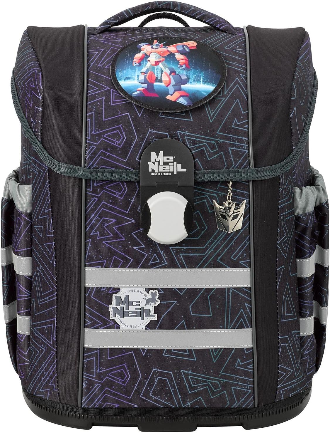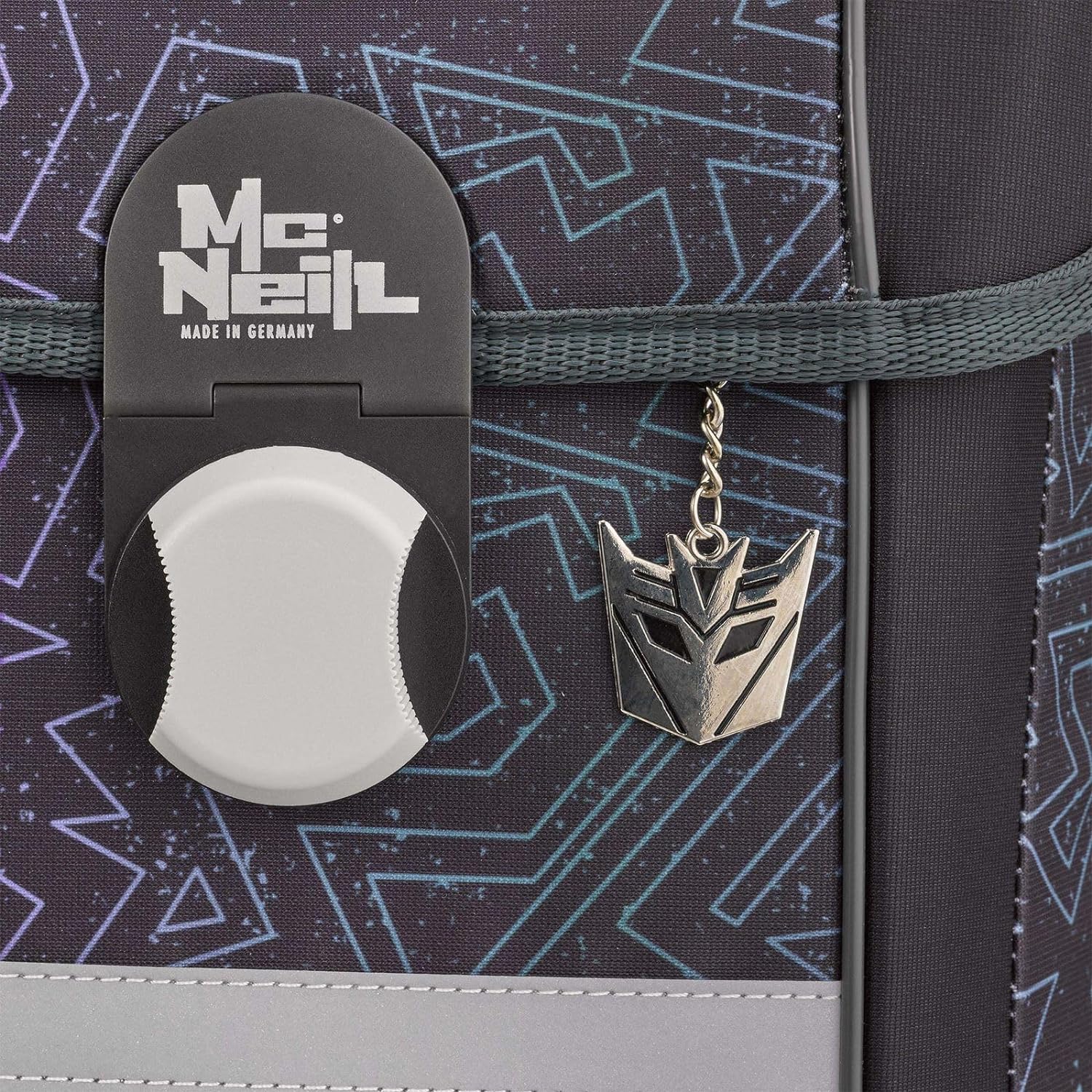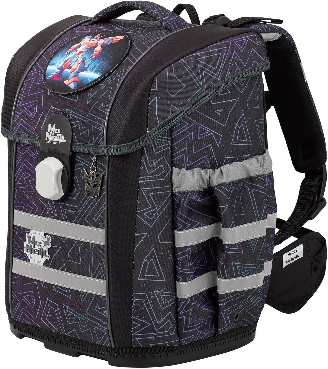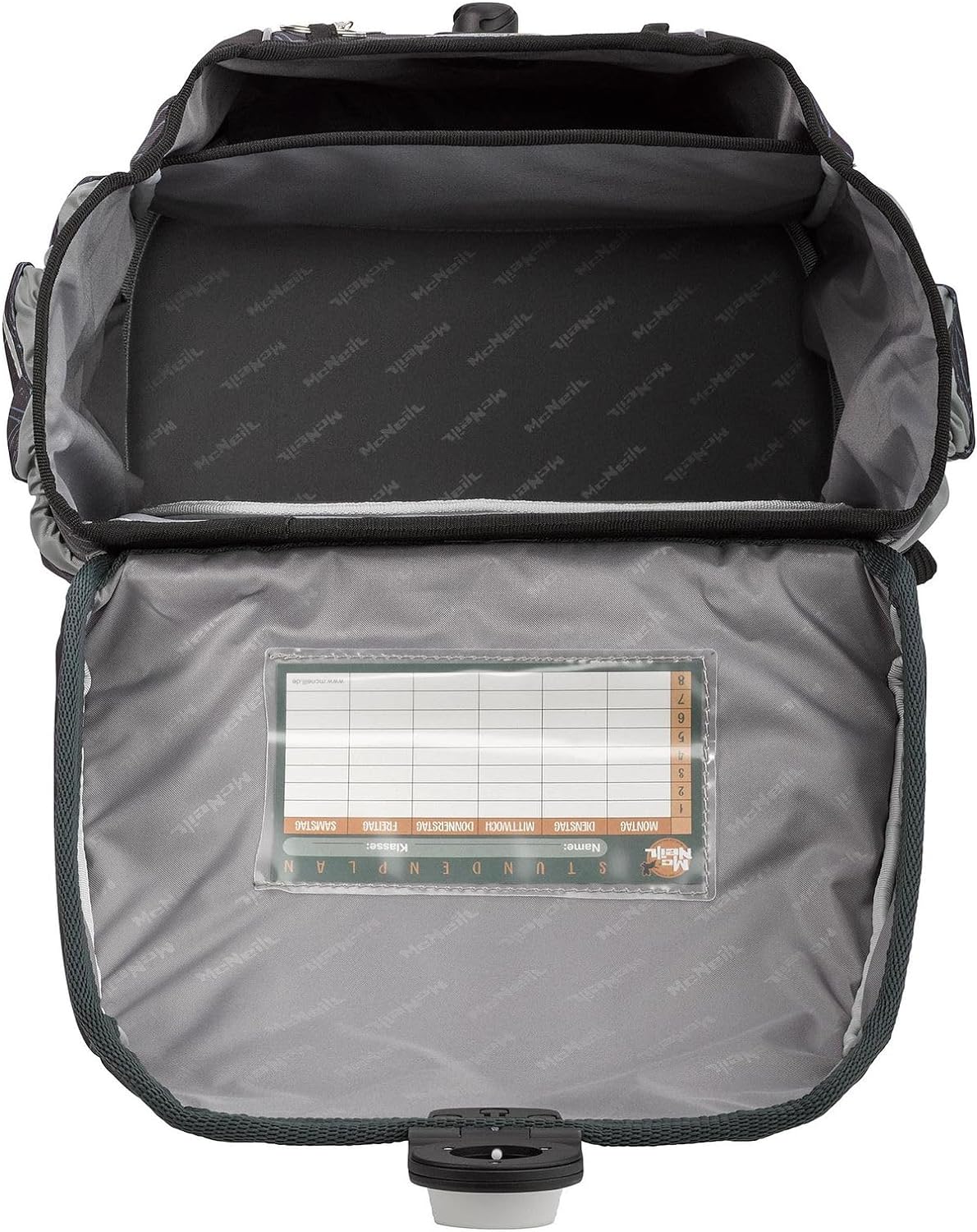 PRODUKTBESCHREIBUNGEN McNeill Schulranzen in einmaligem Muster Lieferumfang McNeill Set: o Schulranzen mit Etikett, Stundenplan, Beckenflosse, McTaggie o Schlüsselanhänger (Schlüsselanhänger) mit Etikett und Schlüsselring o Schlampermäppchen (Schlamperetui) mit Etikett o Federmäppchen (Federmäppchen) mit Etikett und Stundenplan, Geodreieck, Lineal, Radiergummi, Spitzer, Buntstift, Bleistift o Sportbeutel (Sportbeutel) mit Etikett Daten Schulranzen: o Masse: Breite ca. 30 cm, Höhe ca. 36 cm, Tiefe ca. 20 cm o Gewicht: ca. 1430 g o Volumen: ca. 18 l o Farbe: Tron (schwarz / blaugrau / blau) o Auf der Oberseite 1 Tragegriff gepolstert: ca. 15 cm o Auf der Rückseite 1 Tragegriff verstärkt: ca. 15 cm o 2 Schultergurte ergonomisch geformt, atmungsaktiv, gepolstert, stufenlos verstellbar: ca. 35 cm - 70 cm o 1 Brustgurt stufenlos verstellbar: ca. 15 cm - 35 cm o 1 Beckenflosse, abnehmbar, gepolstert: ca. 55 cm o 1 Hüftgurt stufenlos verstellbar: ca. 20 cm - 50 cm o Material: Polyester o Lieferumfang: McNeill Schulranzen mit Etikett, 1 x Stundenplan, 1 x Beckenflosse, 1 x McTaggie, 1 x Trennwand Ausstattung Schulranzen: o Schulranzen wird mit Überschlagklappe und Magnetverschluss geschlossen o Im Hauptfach 1 Einschubfach, 1 herausnehmbare Trennwand und 1 elastische Trennwand o Auf der Oberseite 1 Magnetbefestigung für McTaggie o Auf der Innenseite des Deckels 1 Sichtfach für Stundenpläne o Auf der Vorderseite 2 Befestigungsschlaufen für Anhänger o Auf der rechten und linken Seite 1 elastisches Einschubfach für Trinkflaschen oder Regenschirme und 1 Auslauföse o Auf der Rückseite 2 Haken für Sportbeutel o Rückseite ist ergonomisch geformt und gepolstert o Mit höhenverstellbarem Brustgurt, Lastenkontroll