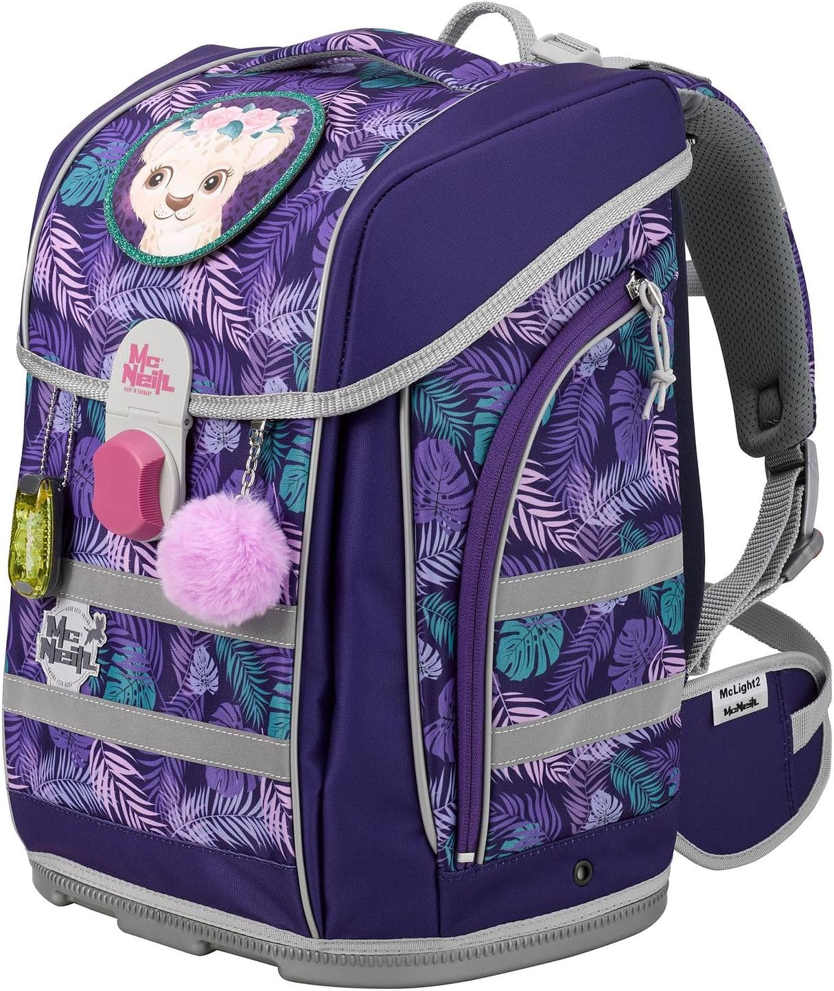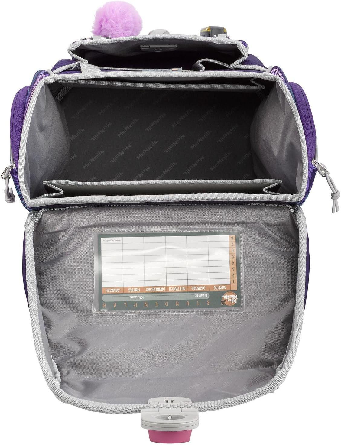 PRODUKTBESCHREIBUNGEN McNeill Schulranzen schenkt jedem Kind ein Lächeln ins Gesicht Lieferumfang McNeill Set: o Schulranzen mit Etikett, Stundenplan, Beckenflosse, McTaggie o Schlüsselanhänger mit Etikett und Schlüsselring o Federmäppchen mit Etikett und Stundenplan, Geodreieck, Lineal, Radiergummi, Spitzer, Buntstift, Bleistift o Schlampermäppchen mit Etikett o Sportbeutel mit Etikett Daten Schulranzen: o Masse: Breite ca. 28 cm, Höhe ca. 36 cm, Tiefe ca. 20 cm o Gewicht: ca. 1000 g o Volumen: ca. 20 l o Farbe: Dschungel (violett / flieder / türkis) o Auf der Oberseite 1 Tragegriff gepolstert: ca. 13 cm o 2 Schultergurte ergonomisch geformt, atmungsaktiv, gepolstert, stufenlos verstellbar: ca. 35 cm - 65 cm o 1 Brustgurt stufenlos verstellbar: ca. 10 cm - 30 cm o 1 Beckenflosse stufenlos verstellbar, abnehmbar, gepolstert: ca. 35 cm - 70 cm o 1 Tragegriff: ca. 11 cm o Material: Polyester o Lieferumfang: McNeill Schulranzen mit Etikett, 1 x McTaggie, 1 x Stundenplan, 1 x Beckenflosse, 1 x LED Licht, 1 x Kette Ausstattung Schulranzen: o Schulranzen wird mit Überschlagklappe und Schnappverschluss geschlossen o Im Hauptfach 2 Einschubfächer o Auf der Überschlagklappe 1 Sichtfach für Stundenpläne o Auf der rechten und linken Seite 1 aufgesetztes Zipperfach o Auf der Vorderseite 1 aufgesetztes Einschubfach, in dem sich 1 Schlüsselfinder und 2 Einschubfächer befindet o Rückseite ist ergonomisch geformt und gepolstert o Mit höhenverstellbarem Brustgurt, Lastenkontrollriemen an den Schultergurten, höhenverstellbarem Tragegurtsystem ausgestattet o Mit verstärktem Boden und fester Bodenplatte ausgestattet o Ist reflektierend o Besitzt flexible Rückenlängenanpassung o Ist gross genug für DIN A4