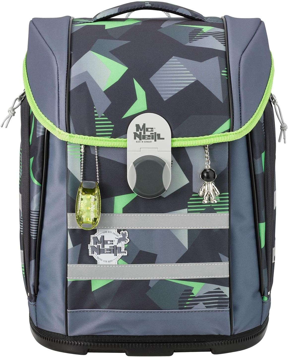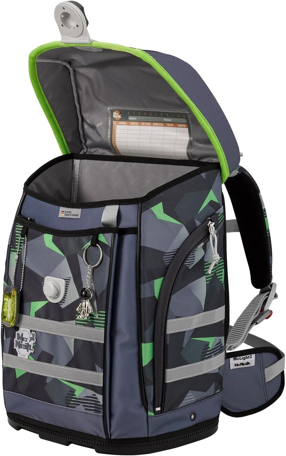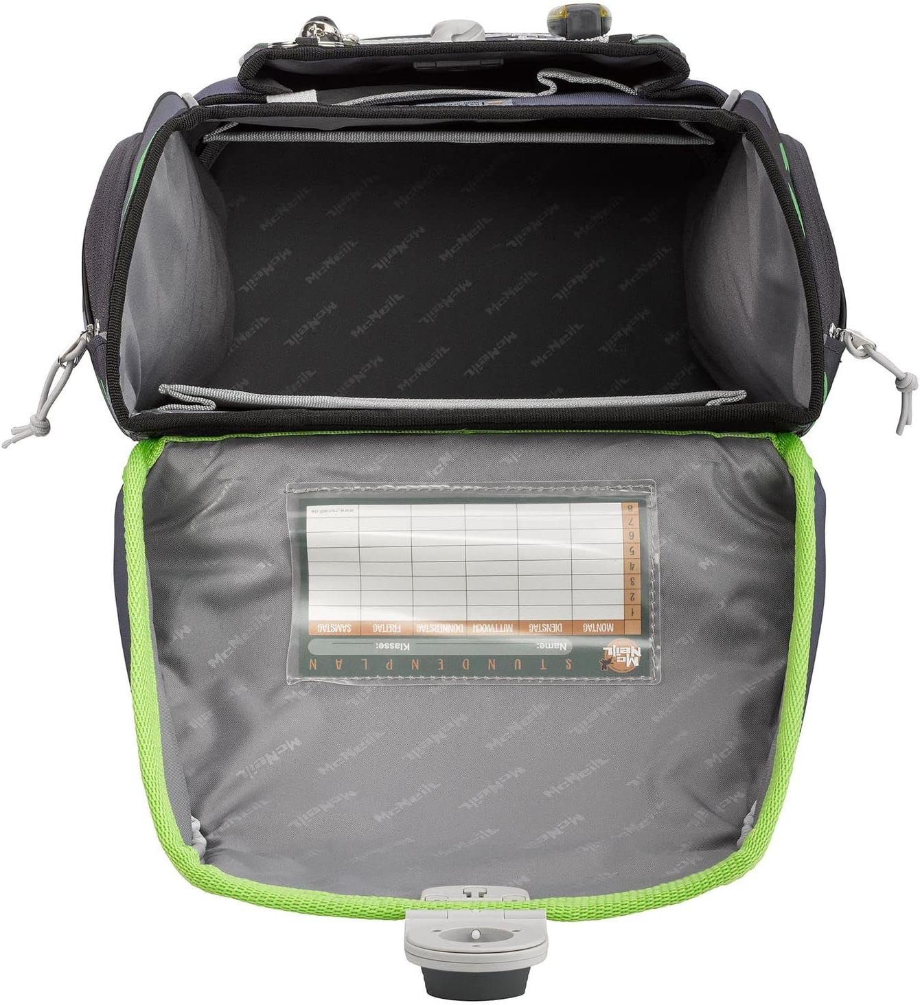PRODUKTBESCHREIBUNGEN McNeill Schulranzen schenkt jedem Kind ein Lächeln ins Gesicht Lieferumfang McNeill Set: o Schulranzen mit Etikett, Stundenplan, Beckenflosse, McTaggie o Schlüsselanhänger mit Etikett und Schlüsselring o Federmäppchen mit Etikett und Stundenplan, Geodreieck, Lineal, Radiergummi, Spitzer, Buntstift, Bleistift o Schlampermäppchen mit Etikett o Sportbeutel mit Etikett Daten Schulranzen: o Masse: Breite ca. 28 cm, Höhe ca. 36 cm, Tiefe ca. 20 cm o Gewicht: ca. 1000 g o Volumen: ca. 20 l o Farbe: Techno (grau / dunkelgrau / hellgrün) o Auf der Oberseite 1 Tragegriff gepolstert: ca. 13 cm o 2 Schultergurte ergonomisch geformt, atmungsaktiv, gepolstert, stufenlos verstellbar: ca. 35 cm - 65 cm o 1 Brustgurt stufenlos verstellbar: ca. 10 cm - 30 cm o 1 Beckenflosse stufenlos verstellbar, abnehmbar, gepolstert: ca. 35 cm - 70 cm o 1 Tragegriff: ca. 11 cm o Material: Polyester o Lieferumfang: McNeill Schulranzen mit Etikett, 1 x McTaggie, 1 x Stundenplan, 1 x Beckenflosse, 1 x LED Licht, 1 x Kette Ausstattung Schulranzen: o Schulranzen wird mit Überschlagklappe und Schnappverschluss geschlossen o Im Hauptfach 2 Einschubfächer o Auf der Überschlagklappe 1 Sichtfach für Stundenpläne o Auf der rechten und linken Seite 1 aufgesetztes Zipperfach o Auf der Vorderseite 1 aufgesetztes Einschubfach, in dem sich 1 Schlüsselfinder und 2 Einschubfächer befindet o Rückseite ist ergonomisch geformt und gepolstert o Mit höhenverstellbarem Brustgurt, Lastenkontrollriemen an den Schultergurten, höhenverstellbarem Tragegurtsystem ausgestattet o Mit verstärktem Boden und fester Bodenplatte ausgestattet o Ist reflektierend o Besitzt flexible Rückenlängenanpassung o Ist gross genug für DIN A4