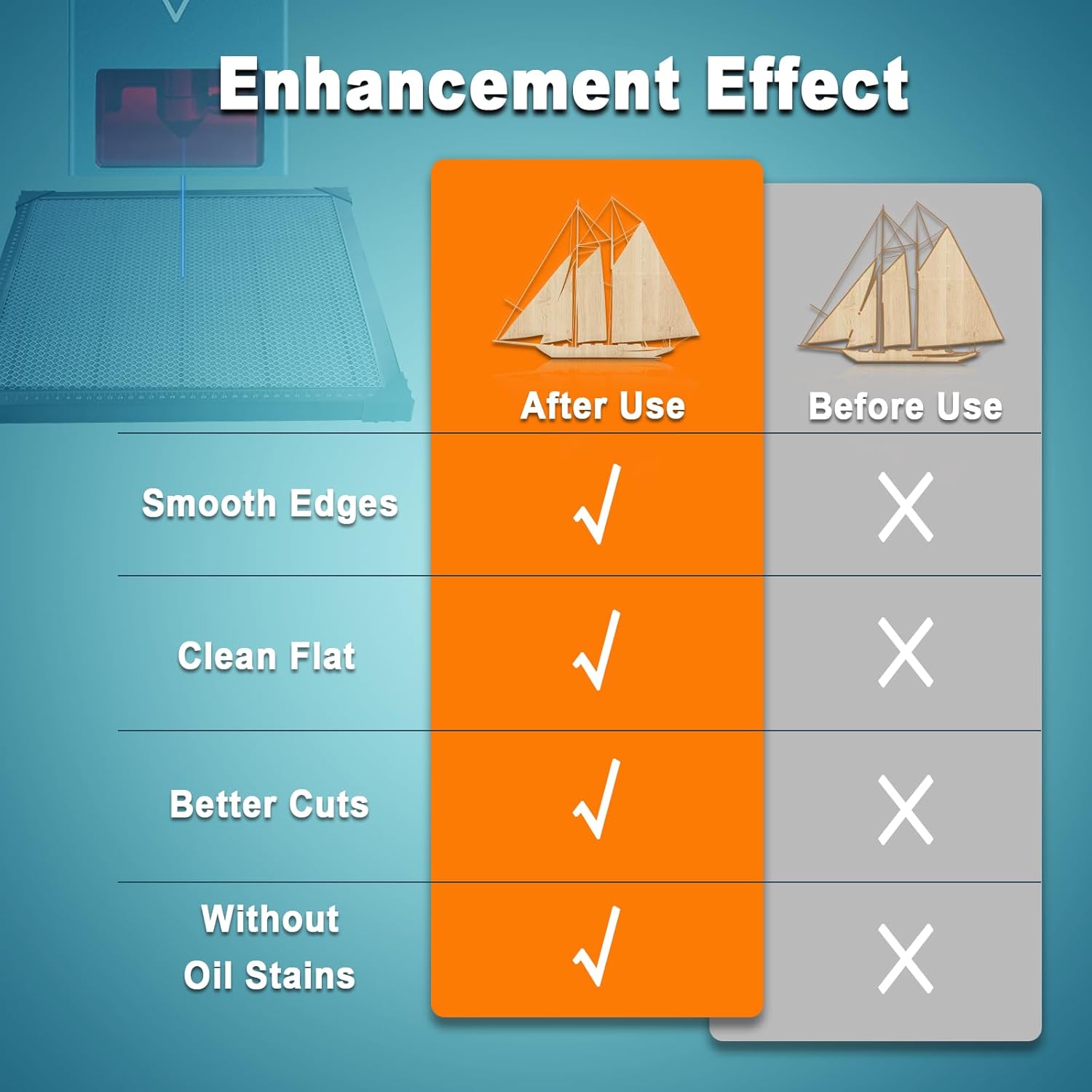 - 【Praktisches Design der Beobachtung】Wenn der Laser Holz oder Acryl schneidet, strahlt das Metallblech am Boden der Wabe ein helles Licht aus, das anzeigt, dass der Schnitt durchgedrungen ist. Er löst das Problem, dass eine gewöhnliche