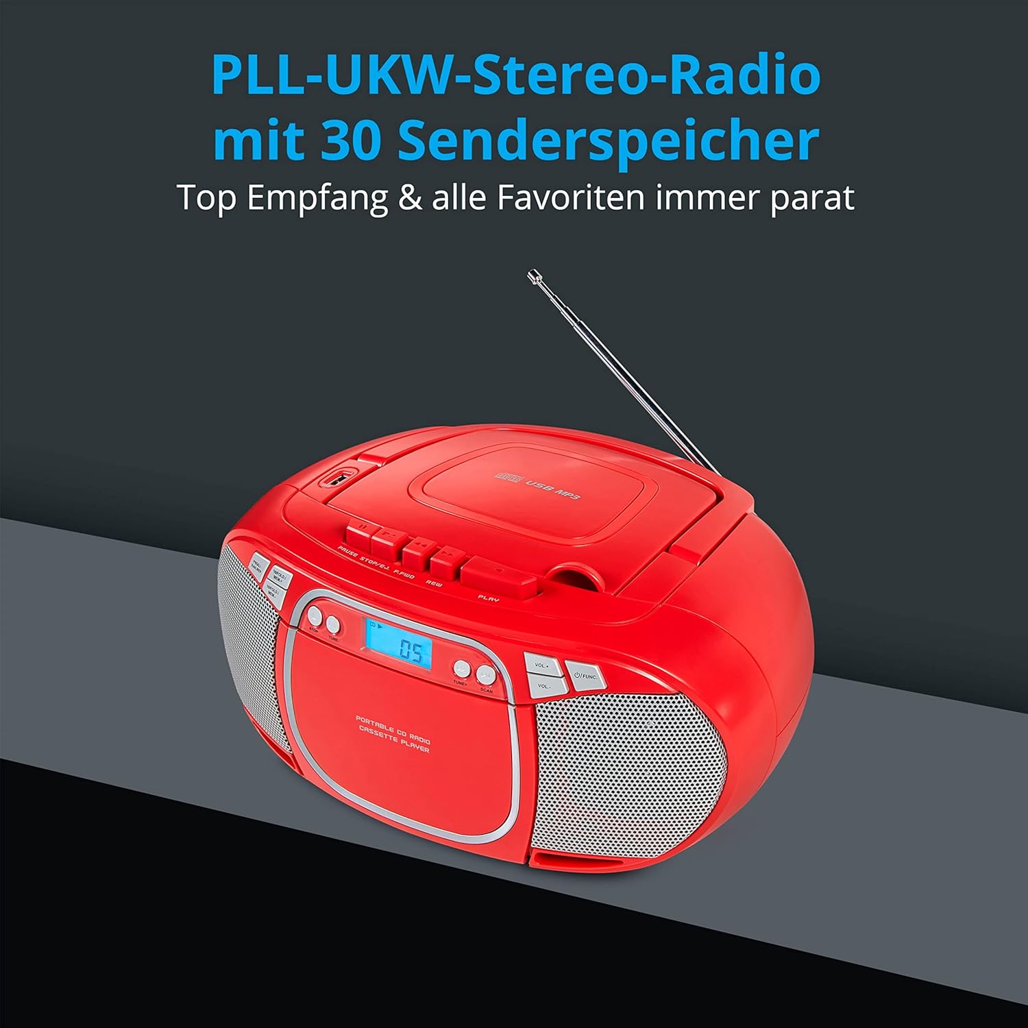 - Boombox Sound System mit CD-/MP3-/Kassettenspieler und PLL-UKW Radio mit 30 Senderspeicher